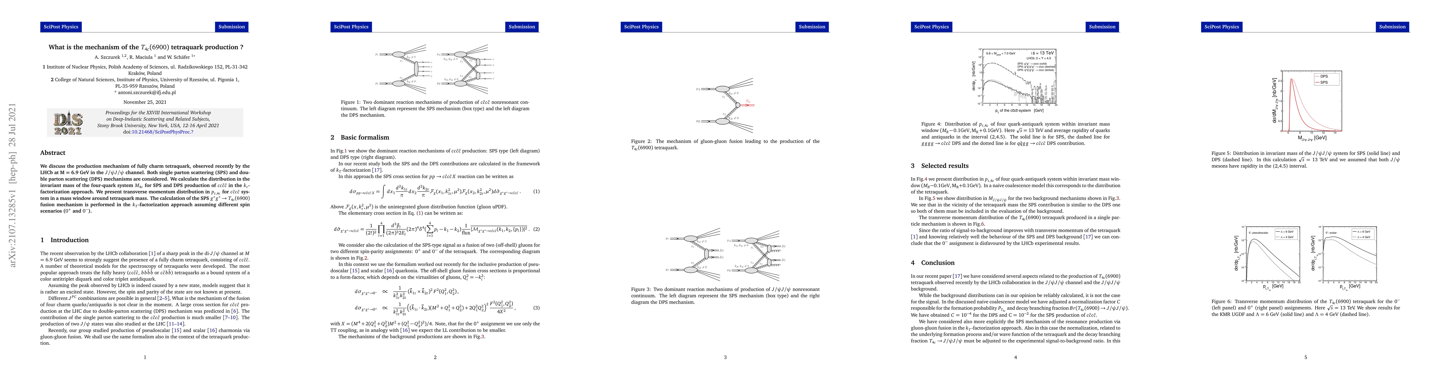 We discuss the production mechanism of fully charm tetraquark, observed recently by the LHCb at M = 6.9 GeV in the $J/\psi J/\psi$ channel. Both single parton scattering (SPS) and double parton scattering (DPS) mechanisms are considered. We calculate the distribution in the invariant mass of the four-quark system $M_{4c}$ for SPS and DPS production of $c c \bar c \bar c$ in the $k_t$-factorization approach. We present transverse momentum distribution in $p_{t,4c}$ for $c \bar c c \bar c$ system in a mass window around tetraquark mass. The calculation of the SPS $g^* g^* \to T_{4c}(6900)$ fusion mechanism is performed in the $k_T$-factorization approach assuming different spin scenarios ($0^+$ and $0^-$).