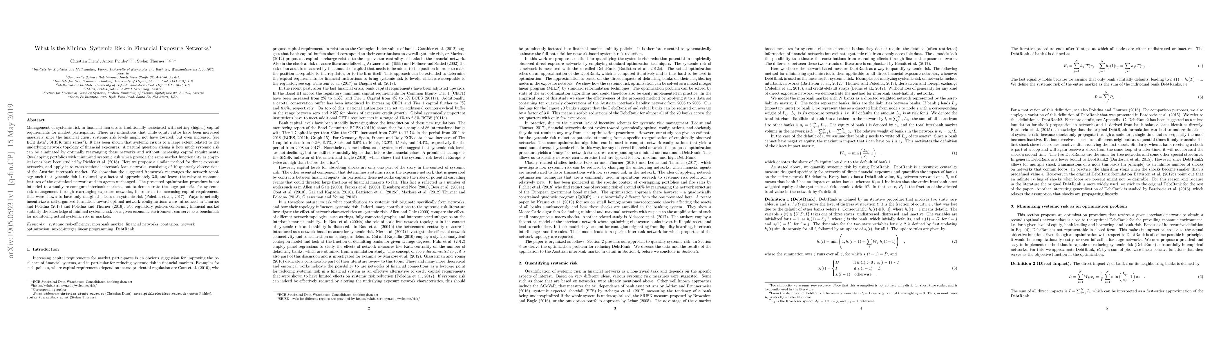 Management of systemic risk in financial markets is traditionally associated with setting (higher) capital requirements for market participants. There are indications that while equity ratios have been increased massively since the financial crisis, systemic risk levels might not have lowered, but even increased. It has been shown that systemic risk is to a large extent related to the underlying network topology of financial exposures. A natural question arising is how much systemic risk can be eliminated by optimally rearranging these networks and without increasing capital requirements. Overlapping portfolios with minimized systemic risk which provide the same market functionality as empirical ones have been studied by [pichler2018]. Here we propose a similar method for direct exposure networks, and apply it to cross-sectional interbank loan networks, consisting of 10 quarterly observations of the Austrian interbank market. We show that the suggested framework rearranges the network topology, such that systemic risk is reduced by a factor of approximately 3.5, and leaves the relevant economic features of the optimized network and its agents unchanged. The presented optimization procedure is not intended to actually re-configure interbank markets, but to demonstrate the huge potential for systemic risk management through rearranging exposure networks, in contrast to increasing capital requirements that were shown to have only marginal effects on systemic risk [poledna2017]. Ways to actually incentivize a self-organized formation toward optimal network configurations were introduced in [thurner2013] and [poledna2016]. For regulatory policies concerning financial market stability the knowledge of minimal systemic risk for a given economic environment can serve as a benchmark for monitoring actual systemic risk in markets.