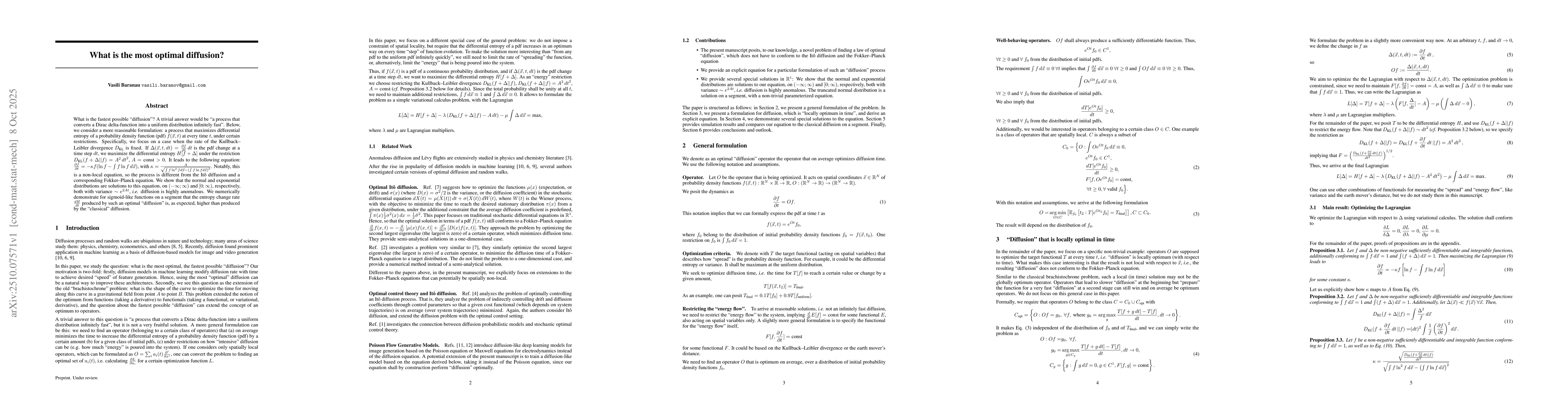 What is the fastest possible "diffusion"? A trivial answer would be "a process that converts a Dirac delta-function into a uniform distribution infinitely fast". Below, we consider a more reasonable formulation: a process that maximizes differential entropy of a probability density function (pdf) $f(\vec{x}, t)$ at every time $t$, under certain restrictions. Specifically, we focus on a case when the rate of the Kullback-Leibler divergence $D_{\text{KL}}$ is fixed. If $\Delta(\vec{x}, t, d{t}) = \frac{\partial f}{ \partial t} d{t}$ is the pdf change at a time step $d{t}$, we maximize the differential entropy $H[f + \Delta]$ under the restriction $D_{\text{KL}}(f + \Delta || f) = A^2 d{t}^2$, $A = \text{const} > 0$. It leads to the following equation: $\frac{\partial f}{ \partial t} = - \kappa f (\ln{f} - \int f \ln{f} d{\vec{x}})$, with $\kappa = \frac{A}{\sqrt{ \int f \ln^2{f} d{\vec{x}} - \left( \int f \ln{f} d{\vec{x}} \right)^2 } }$. Notably, this is a non-local equation, so the process is different from the It\^{o} diffusion and a corresponding Fokker-Planck equation. We show that the normal and exponential distributions are solutions to this equation, on $(-\infty; \infty)$ and $[0; \infty)$, respectively, both with $\text{variance} \sim e^{2 A t}$, i.e. diffusion is highly anomalous. We numerically demonstrate for sigmoid-like functions on a segment that the entropy change rate $\frac{d H}{d t}$ produced by such an optimal "diffusion" is, as expected, higher than produced by the "classical" diffusion.