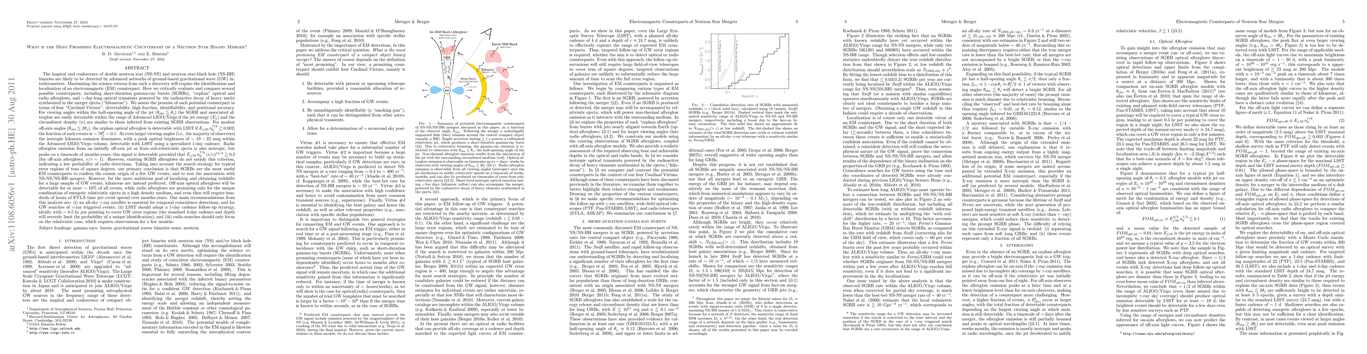 The paper evaluates electromagnetic counterparts for neutron star binary mergers detected via gravitational waves. It concludes that while short-duration gamma-ray bursts (SGRBs) are best for confirming cosmic origin of a few events, kilonovae are preferred for localizing and studying a larger sample due to their detectability and positional accuracy. The study recommends an all-sky gamma-ray satellite, a 1-day cadence follow-up strategy for LSST, and focused radio searches for relativistic cases.