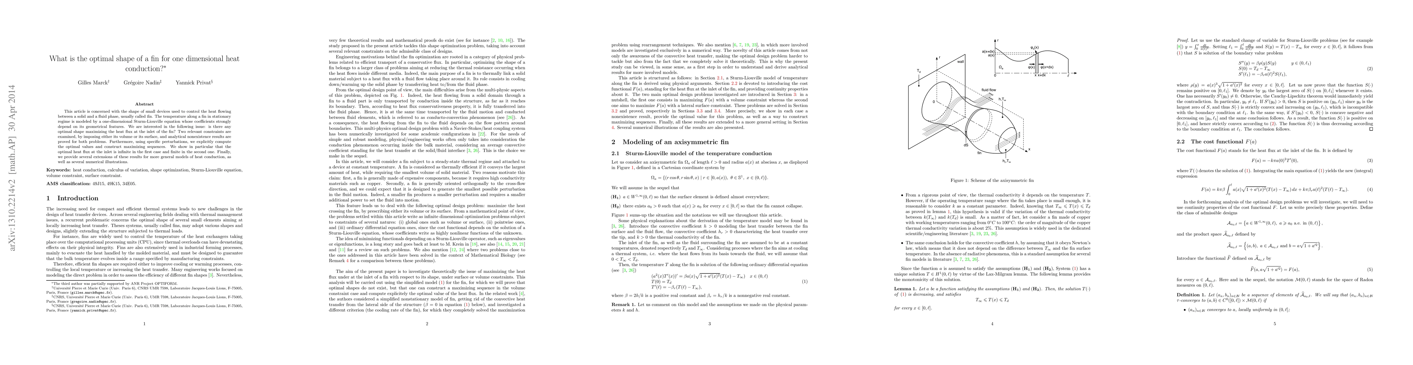 This paper investigates the optimal shape of a fin for one-dimensional heat conduction, proving that no optimal shape exists when volume is constrained, while a finite optimal shape exists when surface is constrained. Analytical and numerical methods are used to explore these constraints and their implications for heat flux.