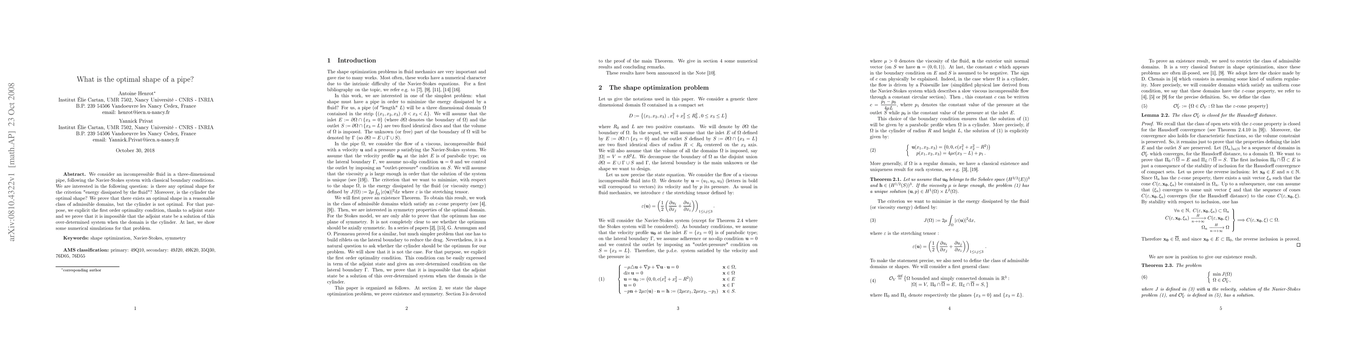 Researchers investigate optimal pipe shape for minimizing energy dissipated by fluid, finding that a cylinder is not the best solution, but a more complex shape exists within a reasonable domain class.