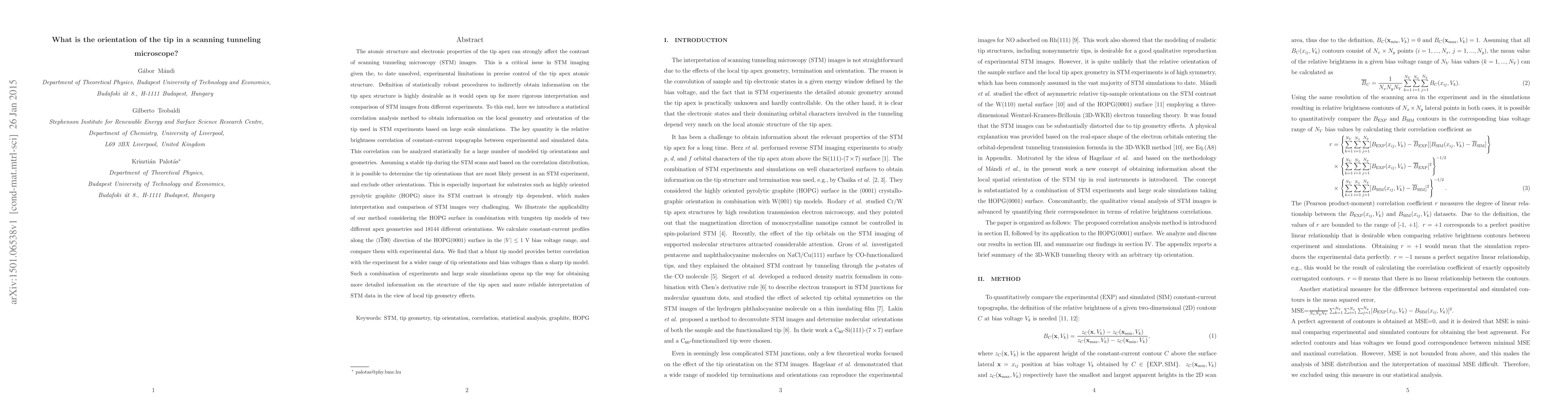 This paper presents a statistical method to determine the orientation of scanning tunneling microscope (STM) tips using large-scale simulations and correlation analysis of brightness in constant-current topographs. It finds that blunt tip models correlate better with experimental data for interpreting STM images on substrates like HOPG.