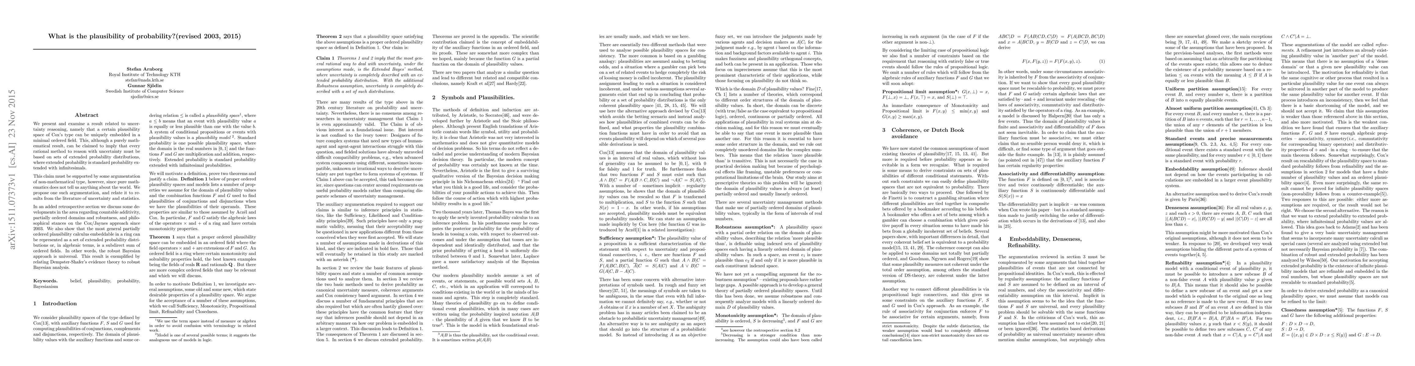 We present and examine a result related to uncertainty reasoning, namely that a certain plausibility space of Cox's type can be uniquely embedded in a minimal ordered field. This, although a purely mathematical result, can be claimed to imply that every rational method to reason with uncertainty must be based on sets of extended probability distributions, where extended probability is standard probability extended with infinitesimals. This claim must be supported by some argumentation of non-mathematical type, however, since pure mathematics does not tell us anything about the world. We propose one such argumentation, and relate it to results from the literature of uncertainty and statistics. In an added retrospective section we discuss some developments in the area regarding countable additivity, partially ordered domains and robustness, and philosophical stances on the Cox/Jaynes approach since 2003. We also show that the most general partially ordered plausibility calculus embeddable in a ring can be represented as a set of extended probability distributions or, in algebraic terms, is a subdirect sum of ordered fields. In other words, the robust Bayesian approach is universal. This result is exemplified by relating Dempster-Shafer's evidence theory to robust Bayesian analysis.
