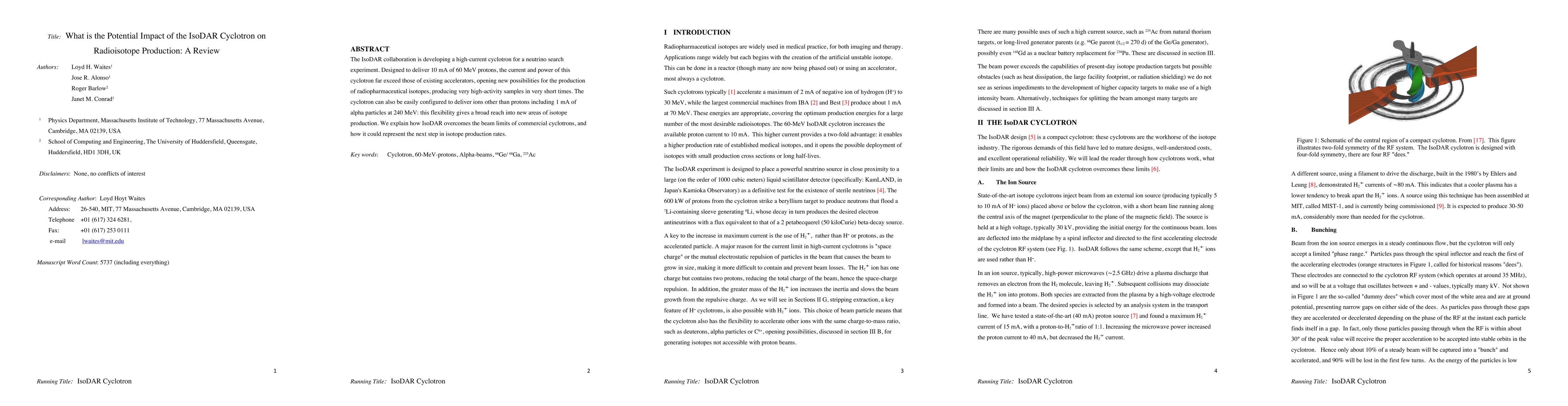 The IsoDAR cyclotron, designed for a neutrino search, offers unprecedented high-current proton beams and flexibility in ion delivery, potentially revolutionizing the production of radiopharmaceutical isotopes by achieving high-activity samples in short times. Its advanced capabilities could significantly enhance isotope production rates beyond current commercial cyclotrons.