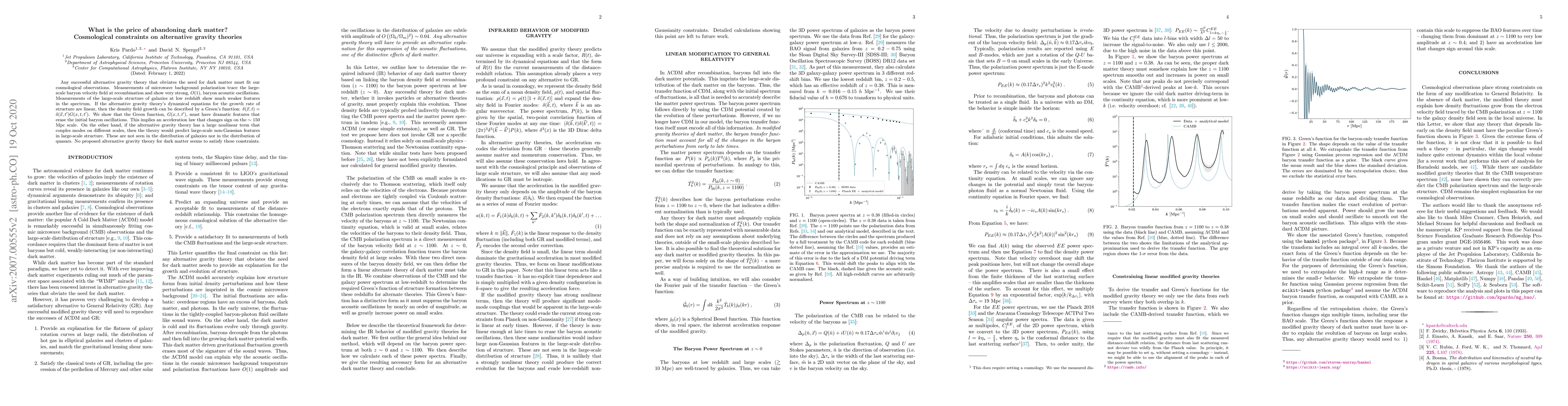 Any successful alternative gravity theory that obviates the need for dark matter must fit our cosmological observations. Measurements of microwave background polarization trace the large-scale baryon velocity field at recombination and show very strong, $O(1)$, baryon acoustic oscillations. Measurements of the large-scale structure of galaxies at low redshift show much weaker features in the spectrum. If the alternative gravity theory's dynamical equations for the growth rate of structure are linear, then the density field growth can be described by a Green's function: $\delta(\vec x,t) = \delta(\vec x,t')G(x,t,t')$. We show that the Green function, $G(x,t,t')$, must have dramatic features that erase the initial baryon oscillations. This implies an acceleration law that changes sign on the $\sim 150$ Mpc scale. On the other hand, if the alternative gravity theory has a large nonlinear term that couples modes on different scales, then the theory would predict large-scale non-Gaussian features in large-scale structure. These are not seen in the distribution of galaxies nor in the distribution of quasars. No proposed alternative gravity theory for dark matter seems to satisfy these constraints.
