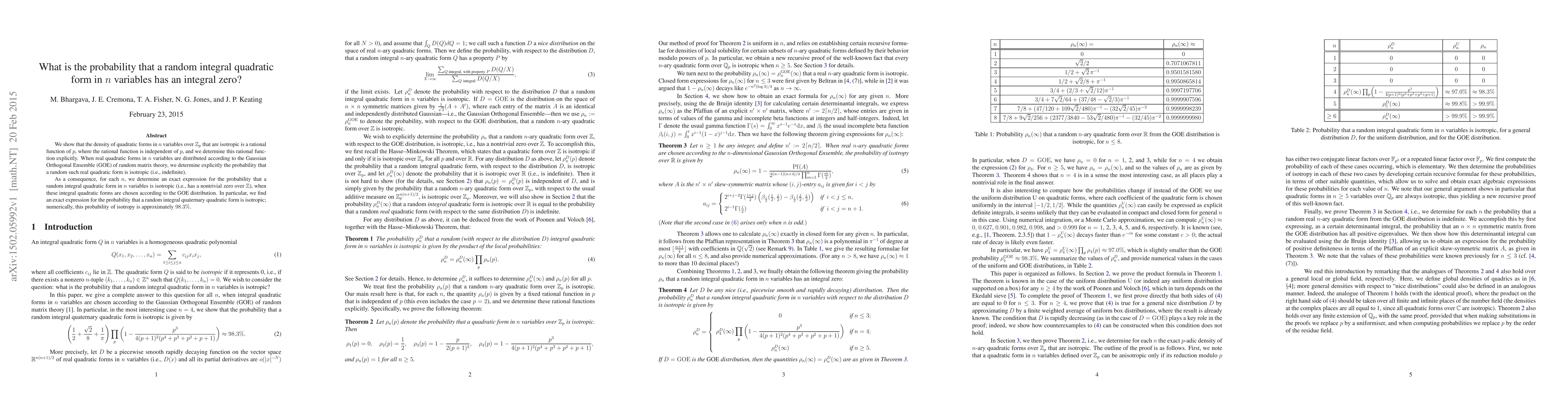 We show that the density of quadratic forms in $n$ variables over $\mathbb Z_p$ that are isotropic is a rational function of $p$, where the rational function is independent of $p$, and we determine this rational function explicitly. When real quadratic forms in $n$ variables are distributed according to the Gaussian Orthogonal Ensemble (GOE) of random matrix theory, we determine explicitly the probability that a random such real quadratic form is isotropic (i.e., indefinite). As a consequence, for each $n$, we determine an exact expression for the probability that a random integral quadratic form in $n$ variables is isotropic (i.e., has a nontrivial zero over $\mathbb Z$), when these integral quadratic forms are chosen according to the GOE distribution. In particular, we find an exact expression for the probability that a random integral quaternary quadratic form has an integral zero; numerically, this probability is approximately $98.3\%$.