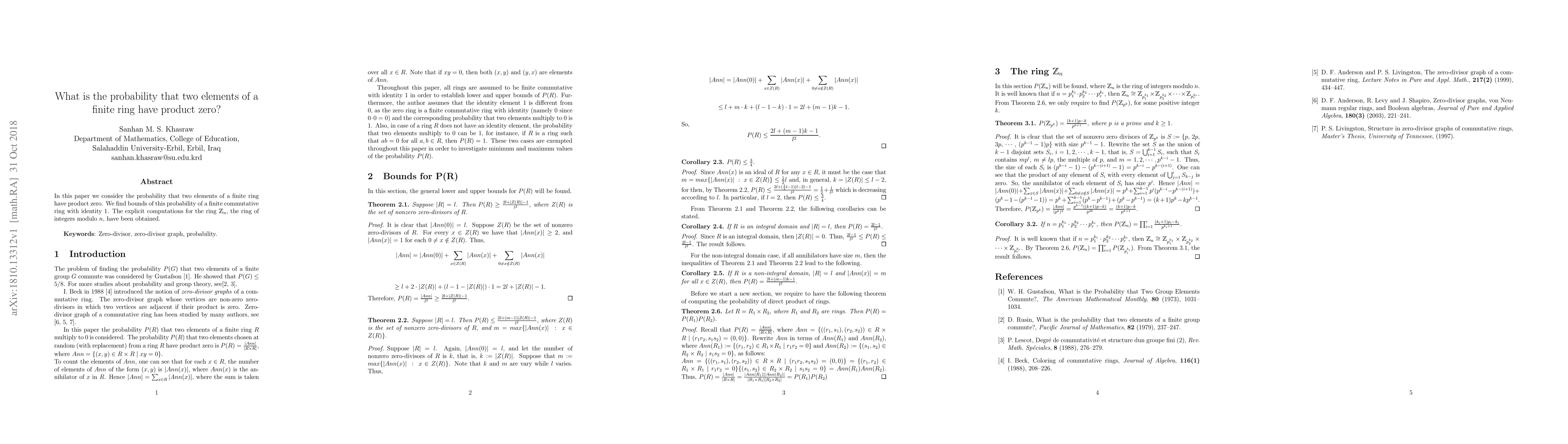 In this paper we consider the probability that two elements of a finite ring have product zero. We find bounds of this probability of a finite commutative ring with identity 1. The explicit computations for the ring $\mathbf{Z}_n$, the ring of integers modulo $n$, have been obtained.