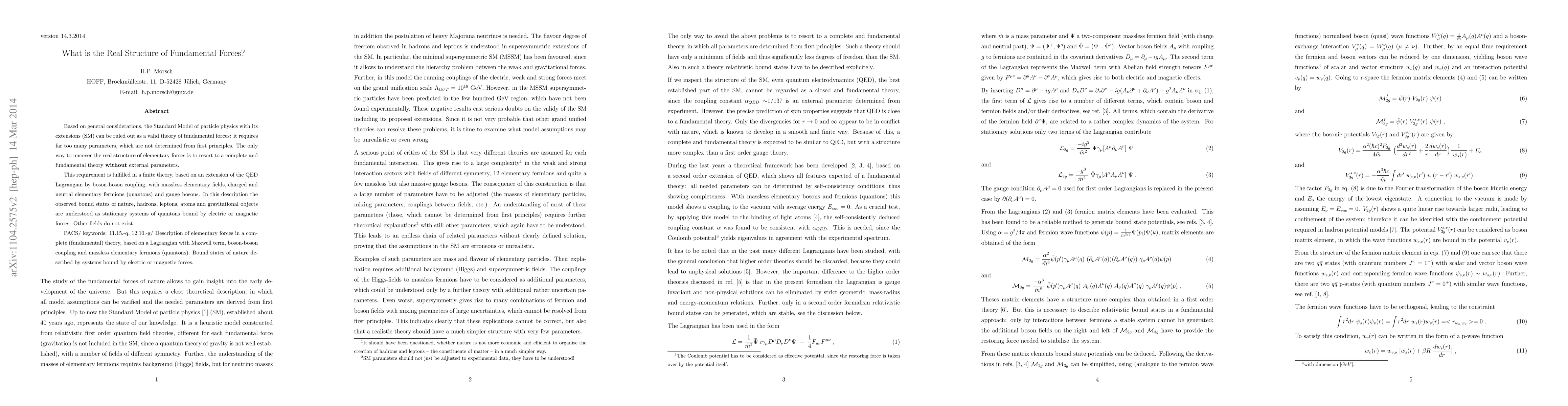 Based on general considerations, the Standard Model of particle physics with its extensions (SM) can be ruled out as a valid theory of fundamental forces: it requires far too many parameters, which are not determined from first principles. The only way to uncover the real structure of elementary forces is to resort to a complete and fundamental theory without external parameters. This requirement is fulfilled in a finite theory, based on an extension of the QED Lagrangian by boson-boson coupling, with massless elementary fields, charged and neutral elementary fermions (quantons) and gauge bosons. In this description the observed bound states of nature, hadrons, leptons, atoms and gravitational objects are understood as stationary systems of quantons bound by electric or magnetic forces. Other fields do not exist.