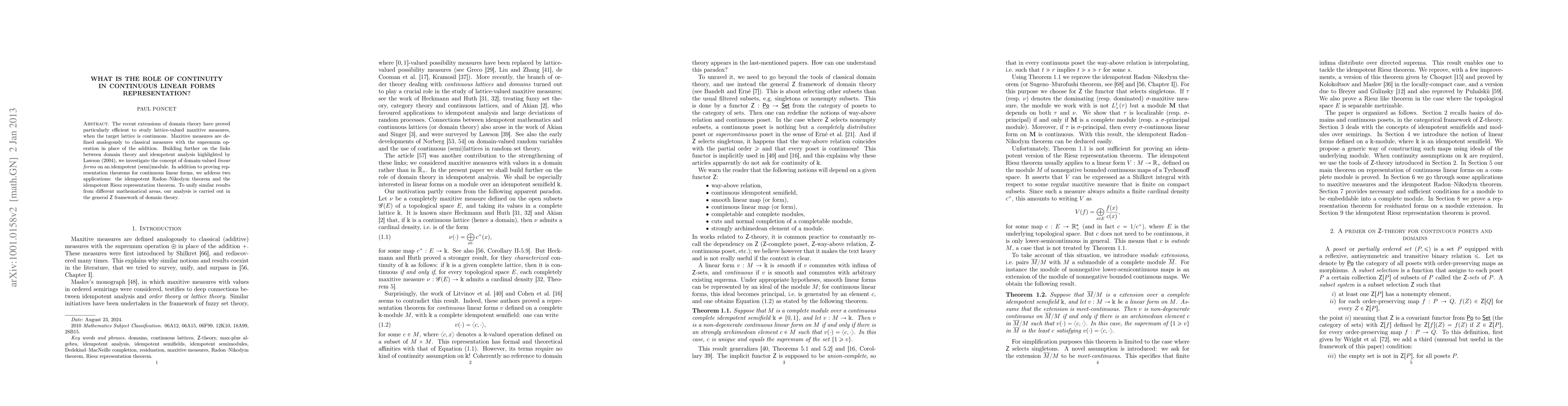 The recent extensions of domain theory have proved particularly efficient to study lattice-valued maxitive measures, when the target lattice is continuous. Maxitive measures are defined analogously to classical measures with the supremum operation in place of the addition. Building further on the links between domain theory and idempotent analysis highlighted by Lawson (2004), we investigate the concept of domain-valued linear forms on an idempotent (semi)module. In addition to proving representation theorems for continuous linear forms, we address two applications: the idempotent Radon--Nikodym theorem and the idempotent Riesz representation theorem. To unify similar results from different mathematical areas, our analysis is carried out in the general Z framework of domain theory.