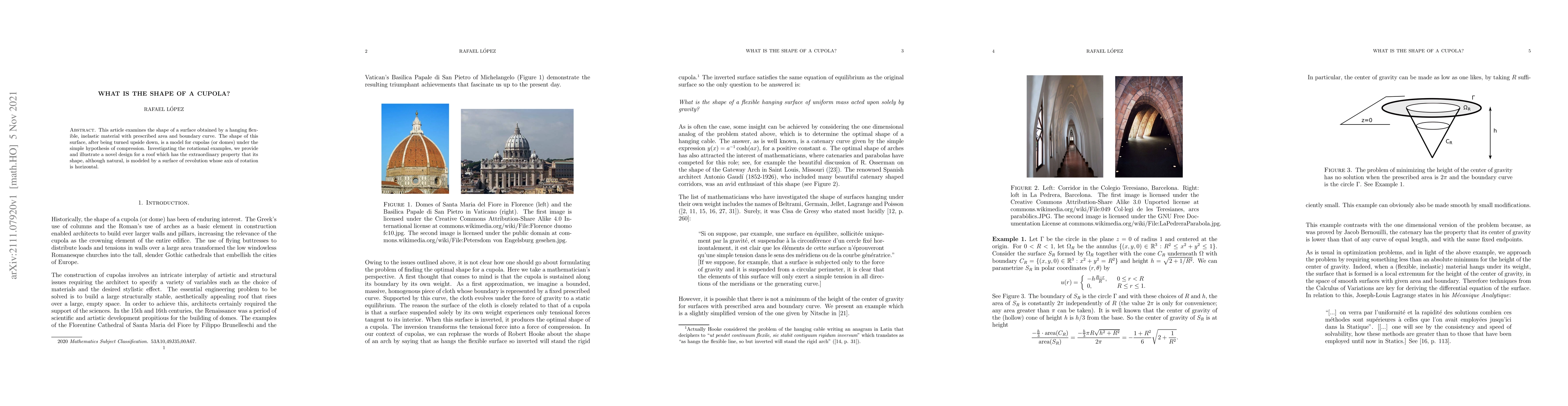 This article examines the shape of a surface obtained by a hanging flexible, inelastic material with prescribed area and boundary curve. The shape of this surface, after being turned upside down, is a model for cupolas (or domes) under the simple hypothesis of compression. Investigating the rotational examples, we provide and illustrate a novel design for a roof which has the extraordinary property that its shape, although natural, is modeled by a surface of revolution whose axis of rotation is horizontal.