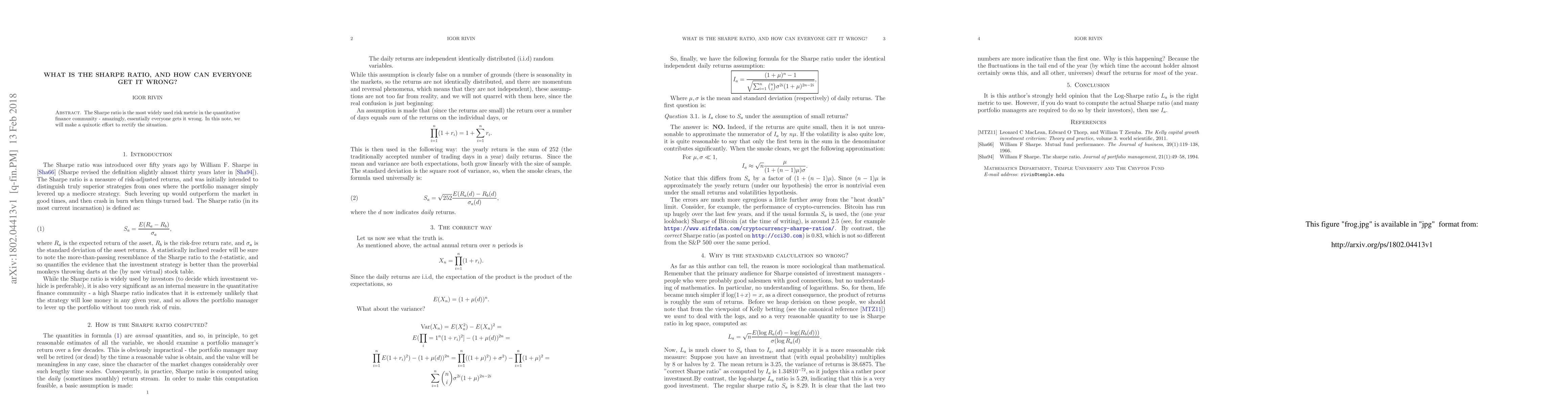 The Sharpe ratio is the most widely used risk metric in the quantitative finance community - amazingly, essentially everyone gets it wrong. In this note, we will make a quixotic effort to rectify the situation.