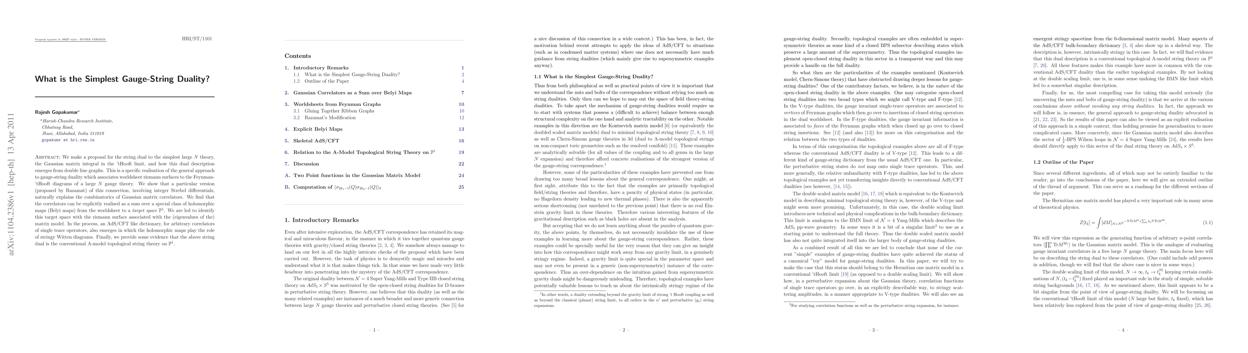 This paper proposes a string dual for the simplest large $N$ theory, the Gaussian matrix integral, showing how it emerges from double line graphs and identifying it with the A-model topological string theory on ${\mathbb P}^1$. It establishes an AdS/CFT-like dictionary using holomorphic maps, specifically Belyi maps, to describe correlators of single trace operators.