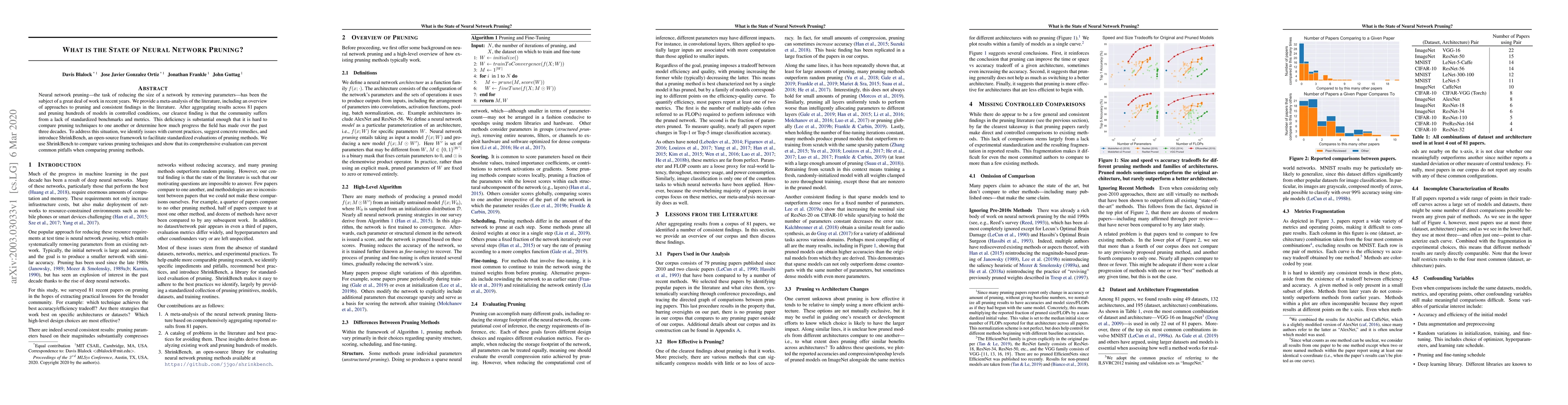 This paper conducts a meta-analysis of neural network pruning literature, highlighting the lack of standardized benchmarks and metrics. It proposes solutions, including the introduction of ShrinkBench, an open-source framework to enable consistent evaluations and comparisons of pruning techniques.