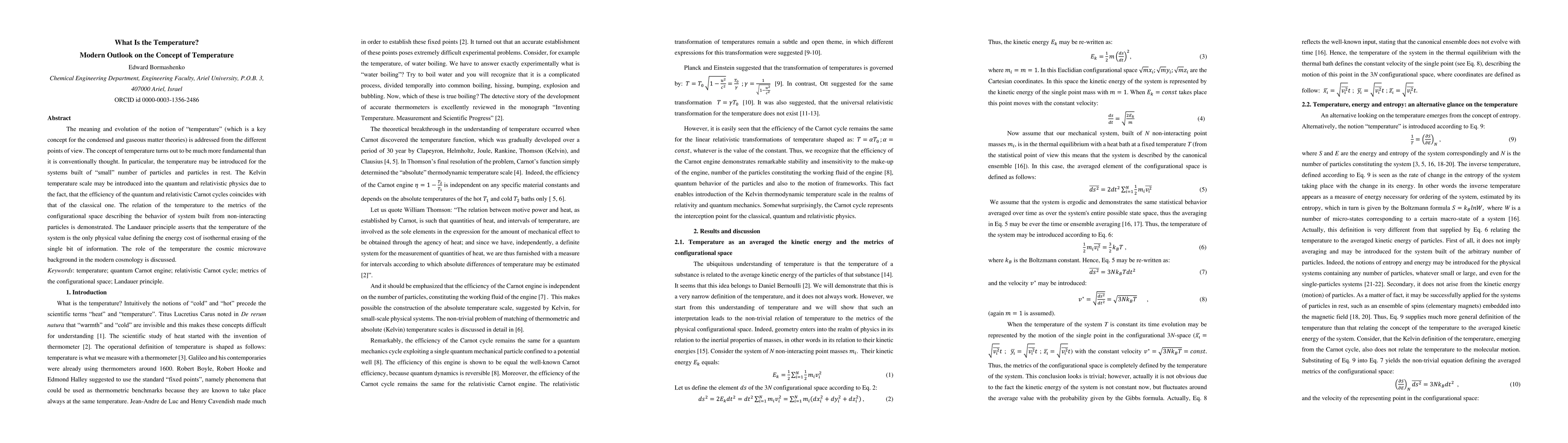 The meaning and evolution of the notion of "temperature" (which is a key concept for the condensed and gaseous matter theories) are addressed from the different points of view. The concept of temperature turns out to be much more fundamental than it is conventionally thought. In particular, the temperature may be introduced for the systems built of "small" number of particles and particles in rest. The Kelvin temperature scale may be introduced into the quantum and relativistic physics due to the fact, that the efficiency of the quantum and relativistic Carnot cycles coincides with that of the classical one. The relation of the temperature to the metrics of the configurational space describing the behavior of the system built from non-interacting particles is demonstrated. The Landauer principle asserts that the temperature of the system is the only physical value defining the energy cost of isothermal erasing of the single bit of information. The role of the temperature the cosmic microwave background in modern cosmology is discussed.