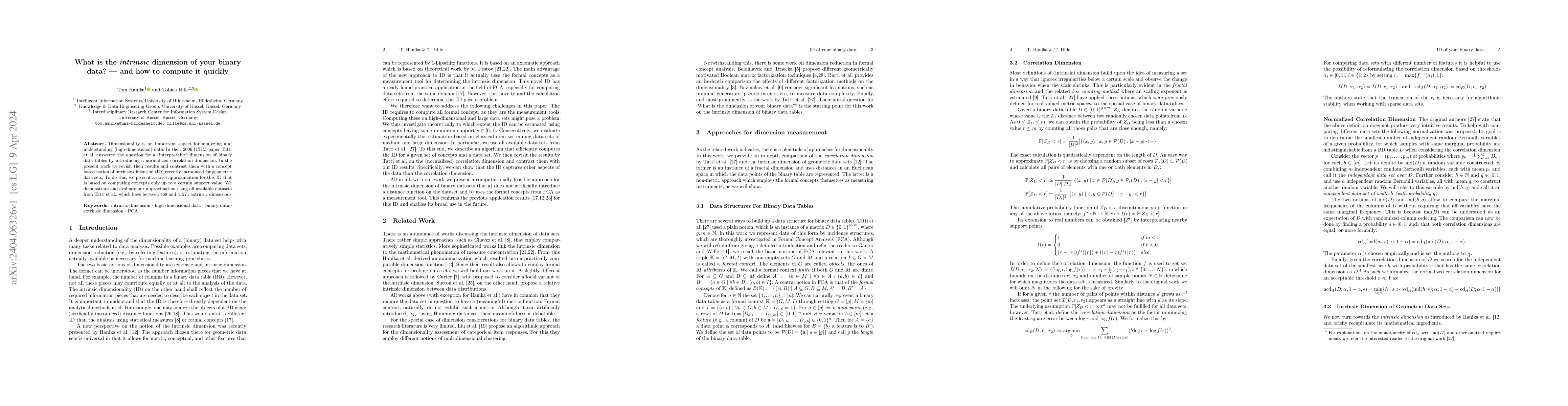The paper discusses a new approximation method for computing the intrinsic dimension of binary data tables, contrasting it with previous methods. The proposed method computes intrinsic dimensions quickly by limiting concept computations to a support value, evaluated using datasets with varying extrinsic dimensions.