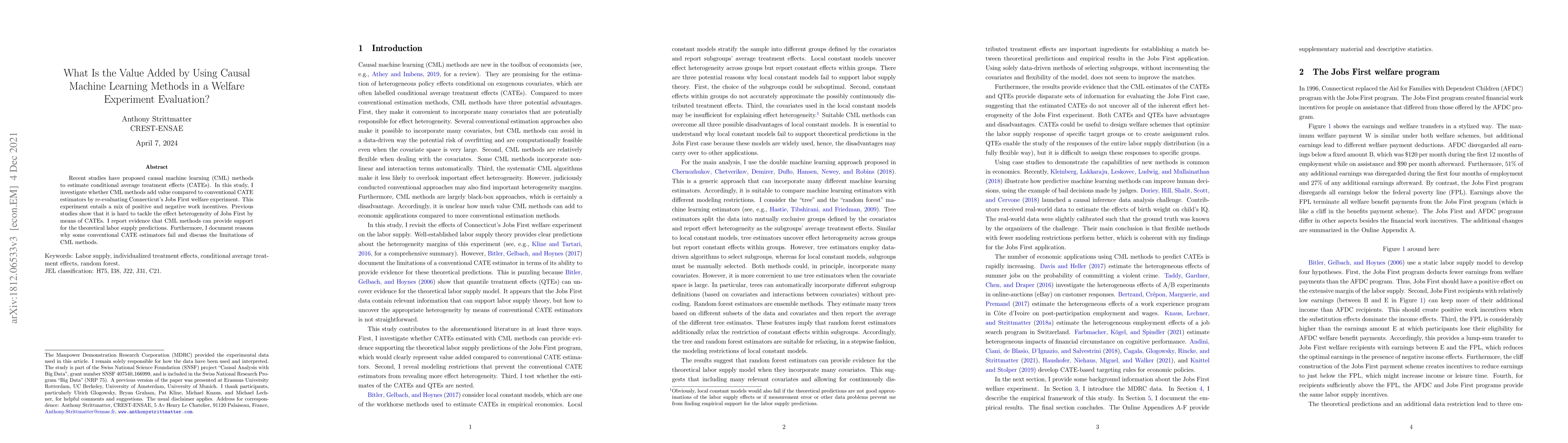Recent studies have proposed causal machine learning (CML) methods to estimate conditional average treatment effects (CATEs). In this study, I investigate whether CML methods add value compared to conventional CATE estimators by re-evaluating Connecticut's Jobs First welfare experiment. This experiment entails a mix of positive and negative work incentives. Previous studies show that it is hard to tackle the effect heterogeneity of Jobs First by means of CATEs. I report evidence that CML methods can provide support for the theoretical labor supply predictions. Furthermore, I document reasons why some conventional CATE estimators fail and discuss the limitations of CML methods.