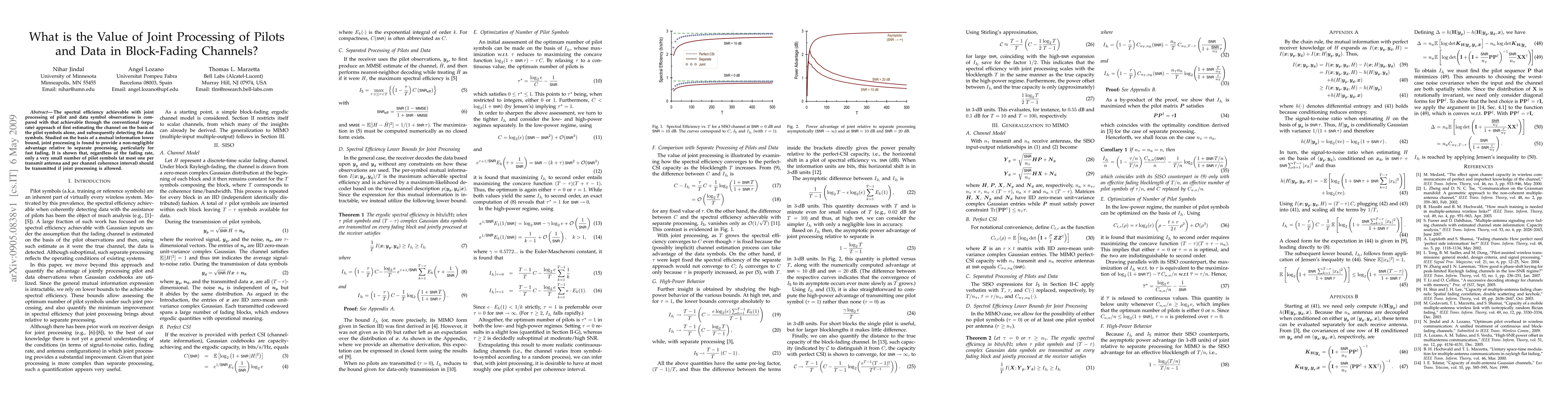 This paper compares the spectral efficiency of joint processing of pilot and data symbols versus separate processing in block-fading channels, finding that joint processing significantly enhances efficiency, especially for fast fading, with minimal pilot symbol requirements.