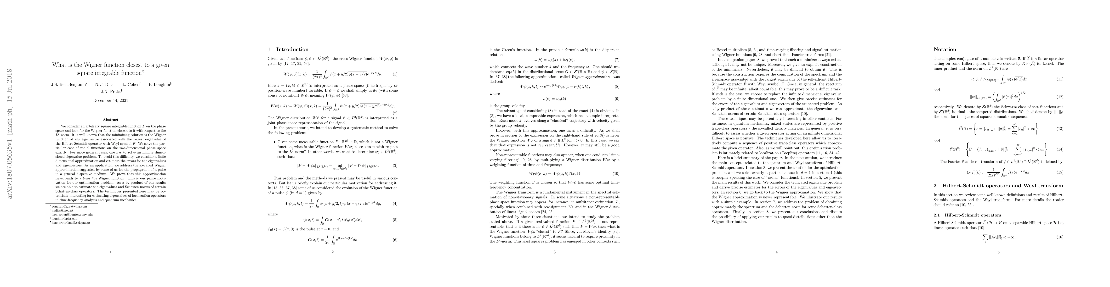 We consider an arbitrary square integrable function $F$ on the phase space and look for the Wigner function closest to it with respect to the $L^2$ norm. It is well known that the minimizing solution is the Wigner function of any eigenvector associated with the largest eigenvalue of the Hilbert-Schmidt operator with Weyl symbol $F$. We solve the particular case of radial functions on the two-dimensional phase space exactly. For more general cases, one has to solve an infinite dimensional eigenvalue problem. To avoid this difficulty, we consider a finite dimensional approximation and estimate the errors for the eigenvalues and eigenvectors. As an application, we address the so-called Wigner approximation suggested by some of us for the propagation of a pulse in a general dispersive medium. We prove that this approximation never leads to a {\it bona fide} Wigner function. This is our prime motivation for our optimization problem. As a by-product of our results we are able to estimate the eigenvalues and Schatten norms of certain Schatten-class operators. The techniques presented here may be potentially interesting for estimating eigenvalues of localization operators in time-frequency analysis and quantum mechanics.