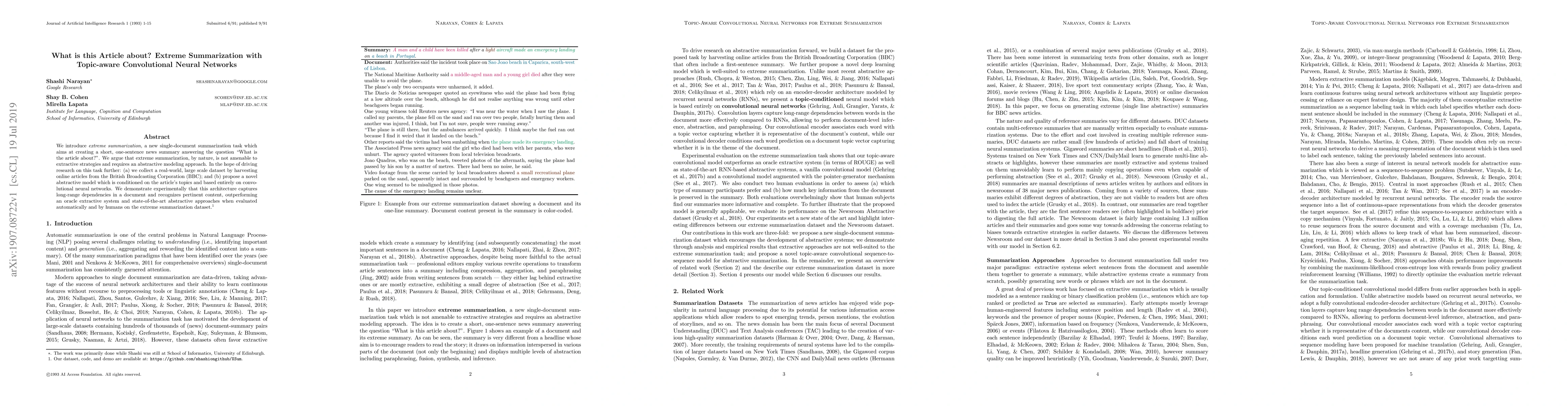 Researchers introduce a new summarization task called 'extreme summarization' that aims to create one-sentence summaries of articles answering the question 'What is the article about?' They propose a novel abstractive model using convolutional neural networks that outperforms existing approaches.