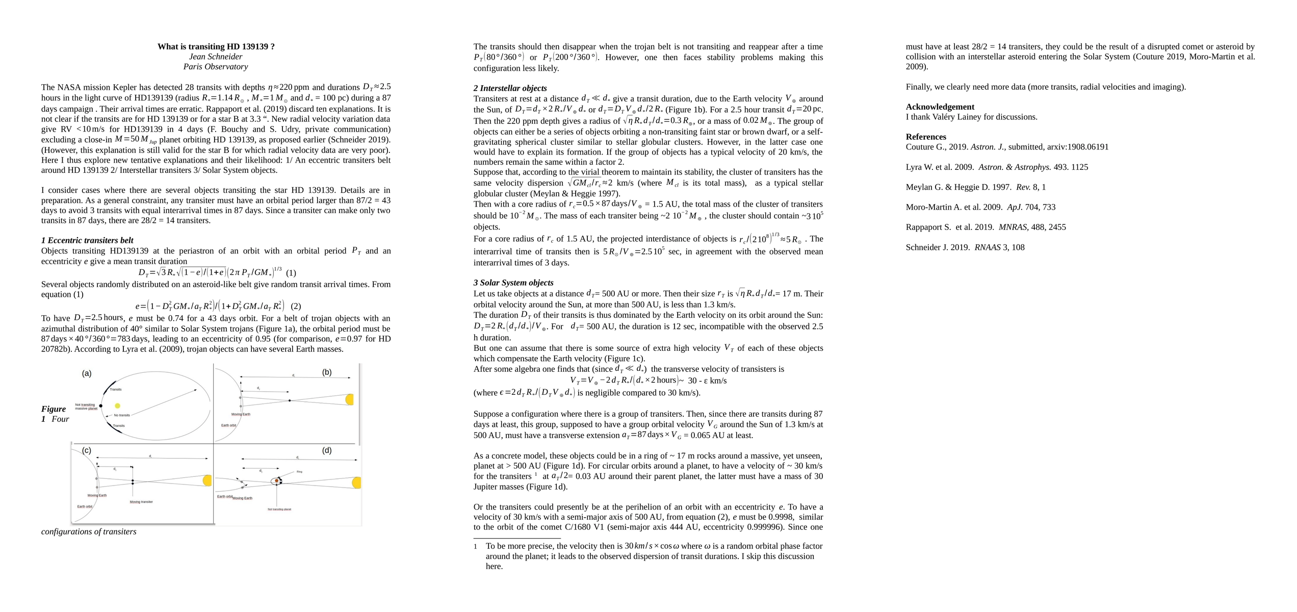 The NASA mission Kepler has detected 28 transits with depths and durations hours in the light curve of HD139139 during a 87 days campaign . Their arrival times are erratic. Rappaport et al. (2019) discard ten explanations. It is not clear if the transits are for HD 139139 or for a star B at 3.3 arcsec. New radial velocity variation data give RV for HD139139 in 4 days (F. Bouchy and S. Udry, private communication) excluding a close-in planet orbiting HD 139139, as proposed earlier (Schneider 2019). (However, this explanation is still valid for the star B for which radial velocity data are very poor). Here I thus explore new tentative explanations and their likelihood: 1/ An eccentric transiters belt around HD 139139 2/ Interstellar transiters 3/ Solar System objects.