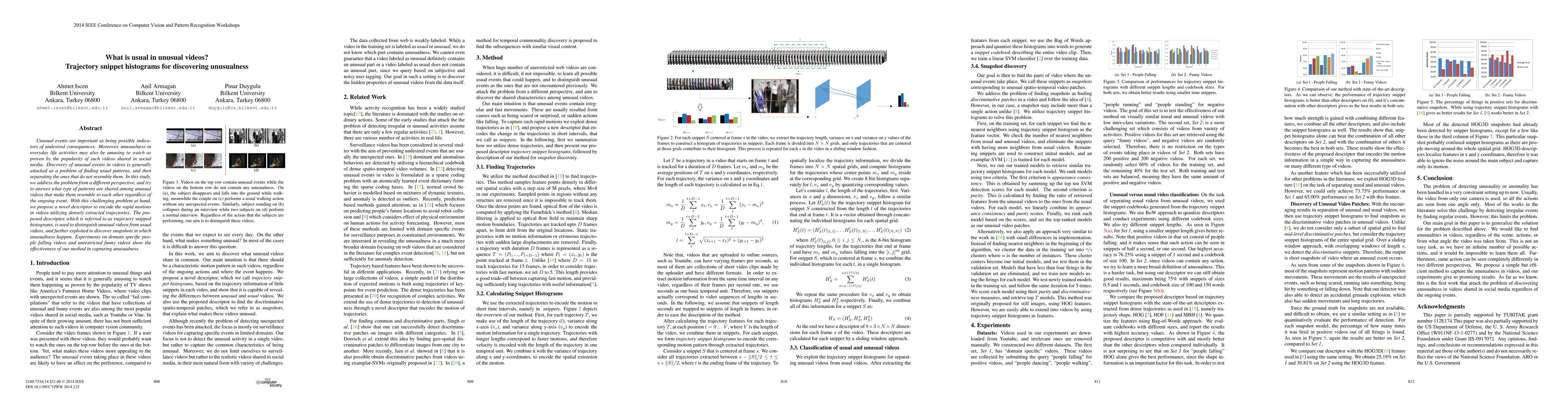 Unusual events are important as being possible indicators of undesired consequences. Moreover, unusualness in everyday life activities may also be amusing to watch as proven by the popularity of such videos shared in social media. Discovery of unusual events in videos is generally attacked as a problem of finding usual patterns, and then separating the ones that do not resemble to those. In this study, we address the problem from the other side, and try to answer what type of patterns are shared among unusual videos that make them resemble to each other regardless of the ongoing event. With this challenging problem at hand, we propose a novel descriptor to encode the rapid motions in videos utilizing densely extracted trajectories. The proposed descriptor, which is referred to as trajectory snipped histograms, is used to distinguish unusual videos from usual videos, and further exploited to discover snapshots in which unusualness happen. Experiments on domain specific people falling videos and unrestricted funny videos show the effectiveness of our method in capturing unusualness.