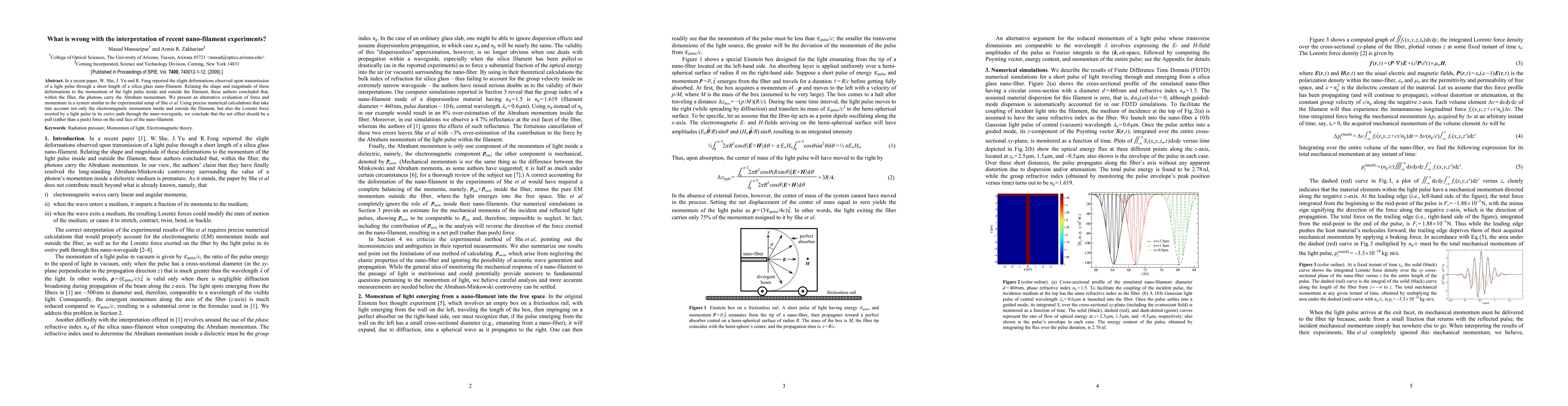 In a recent paper, W. She, J. Yu and R. Feng reported the slight deformations observed upon transmission of a light pulse through a short length of a silica glass nano-filament. Relating the shape and magnitude of these deformations to the momentum of the light pulse inside and outside the filament, these authors concluded that, within the fiber, the photons carry the Abraham momentum. We present an alternative evaluation of force and momentum in a system similar to the experimental setup of She et al. Using precise numerical calculations that take into account not only the electromagnetic momentum inside and outside the filament, but also the Lorentz force exerted by a light pulse in its entire path through the nano-waveguide, we conclude that the net effect should be a pull (rather than a push) force on the end face of the nano-filament.