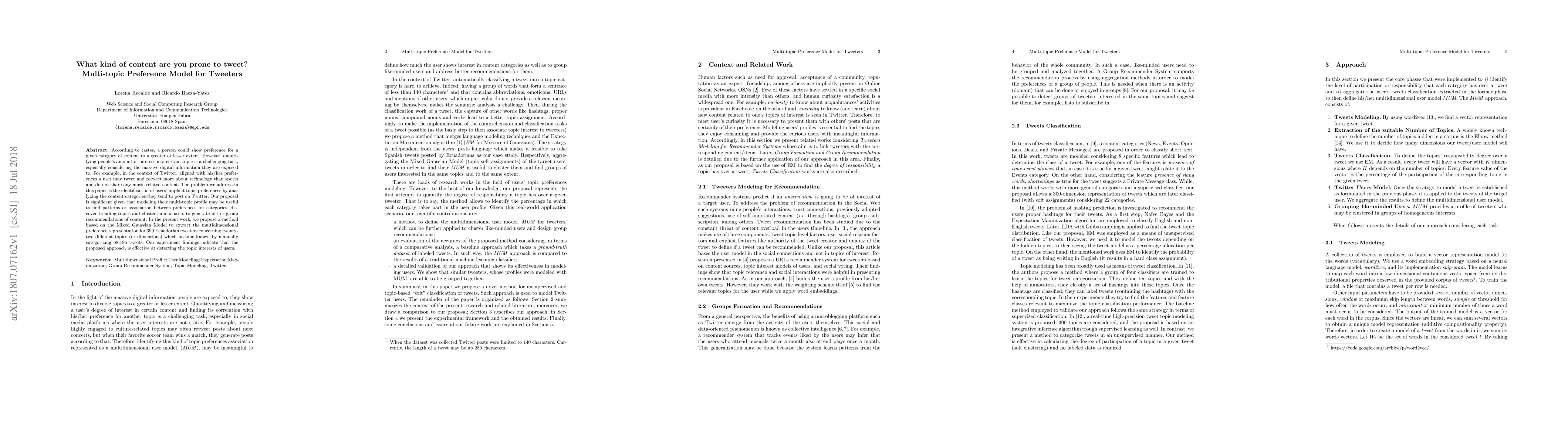 This paper proposes a Mixed Gaussian Model to identify Twitter users' implicit topic preferences by analyzing their tweet content. The method effectively extracts multidimensional preference representations from 399 Ecuadorian tweeters, revealing patterns and associations between different topic interests.