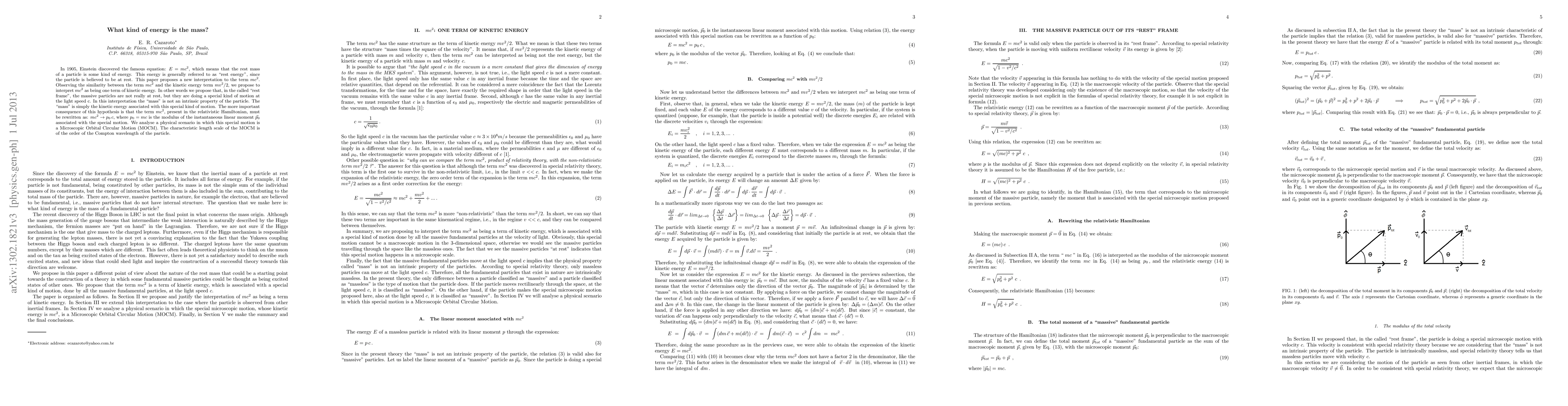 In 1905, Einstein discovered the famous equation: E=mc^2, which means that the rest mass of a particle is some kind of energy. This energy is generally referred to as "rest energy", since the particle is believed to be at rest. This paper proposes a new interpretation to the term mc^2. Observing the similarity between the term mc^2 and the kinetic energy term mv^2/2, we propose to interpret mc^2 as being one term of kinetic energy. In other words we propose that, in the called "rest frame", the massive particles are not really at rest, but they are doing a special kind of motion at the light speed c. In this interpretation the "mass" is not an intrinsic property of the particle. The "mass" is simply the kinetic energy associated with this special kind of motion. The more important consequence of this hypothesis is that the term mc^2, present in the relativistic Hamiltonian, must be rewritten as: mc^2 => p_0 c, where p_0 = mc is the modulus of the instantaneous linear moment \vec{p}_0 associated with the special motion. We analyse a physical scenario in which this special motion is a Microscopic Orbital Circular Motion (MOCM). The characteristic length scale of the MOCM is of the order of the Compton wavelength of the particle.