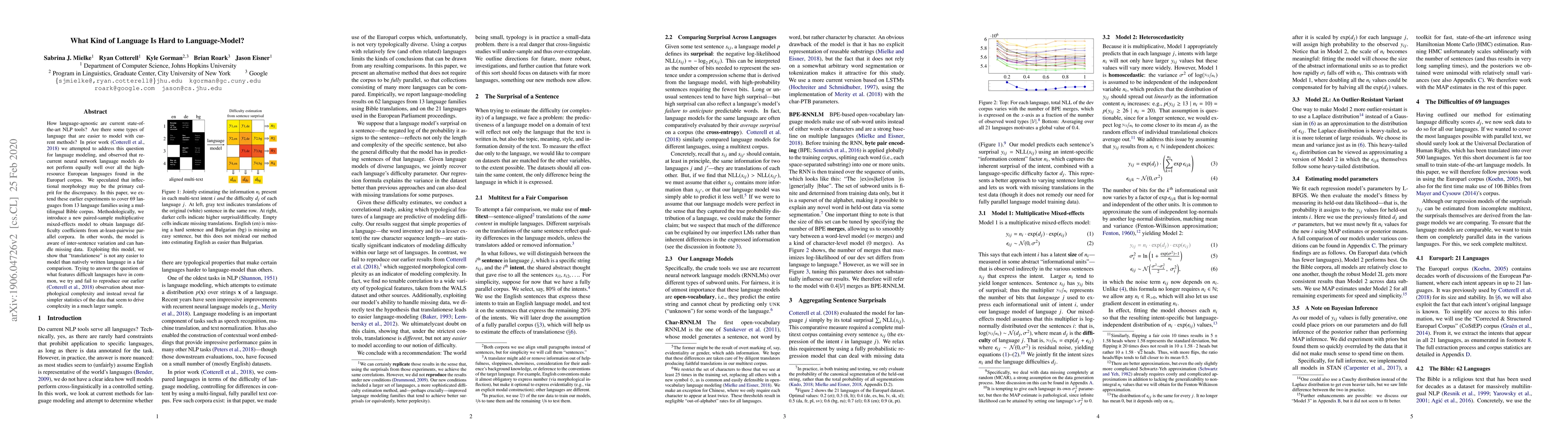 How language-agnostic are current state-of-the-art NLP tools? Are there some types of language that are easier to model with current methods? In prior work (Cotterell et al., 2018) we attempted to address this question for language modeling, and observed that recurrent neural network language models do not perform equally well over all the high-resource European languages found in the Europarl corpus. We speculated that inflectional morphology may be the primary culprit for the discrepancy. In this paper, we extend these earlier experiments to cover 69 languages from 13 language families using a multilingual Bible corpus. Methodologically, we introduce a new paired-sample multiplicative mixed-effects model to obtain language difficulty coefficients from at-least-pairwise parallel corpora. In other words, the model is aware of inter-sentence variation and can handle missing data. Exploiting this model, we show that "translationese" is not any easier to model than natively written language in a fair comparison. Trying to answer the question of what features difficult languages have in common, we try and fail to reproduce our earlier (Cotterell et al., 2018) observation about morphological complexity and instead reveal far simpler statistics of the data that seem to drive complexity in a much larger sample.