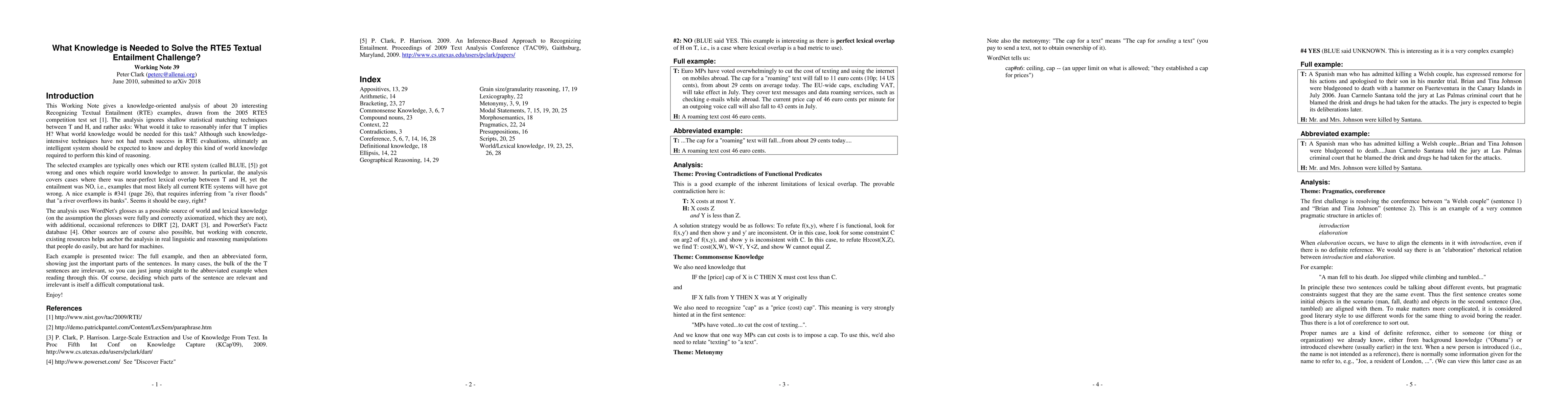 This document gives a knowledge-oriented analysis of about 20 interesting Recognizing Textual Entailment (RTE) examples, drawn from the 2005 RTE5 competition test set. The analysis ignores shallow statistical matching techniques between T and H, and rather asks: What would it take to reasonably infer that T implies H? What world knowledge would be needed for this task? Although such knowledge-intensive techniques have not had much success in RTE evaluations, ultimately an intelligent system should be expected to know and deploy this kind of world knowledge required to perform this kind of reasoning. The selected examples are typically ones which our RTE system (called BLUE) got wrong and ones which require world knowledge to answer. In particular, the analysis covers cases where there was near-perfect lexical overlap between T and H, yet the entailment was NO, i.e., examples that most likely all current RTE systems will have got wrong. A nice example is #341 (page 26), that requires inferring from "a river floods" that "a river overflows its banks". Seems it should be easy, right? Enjoy!