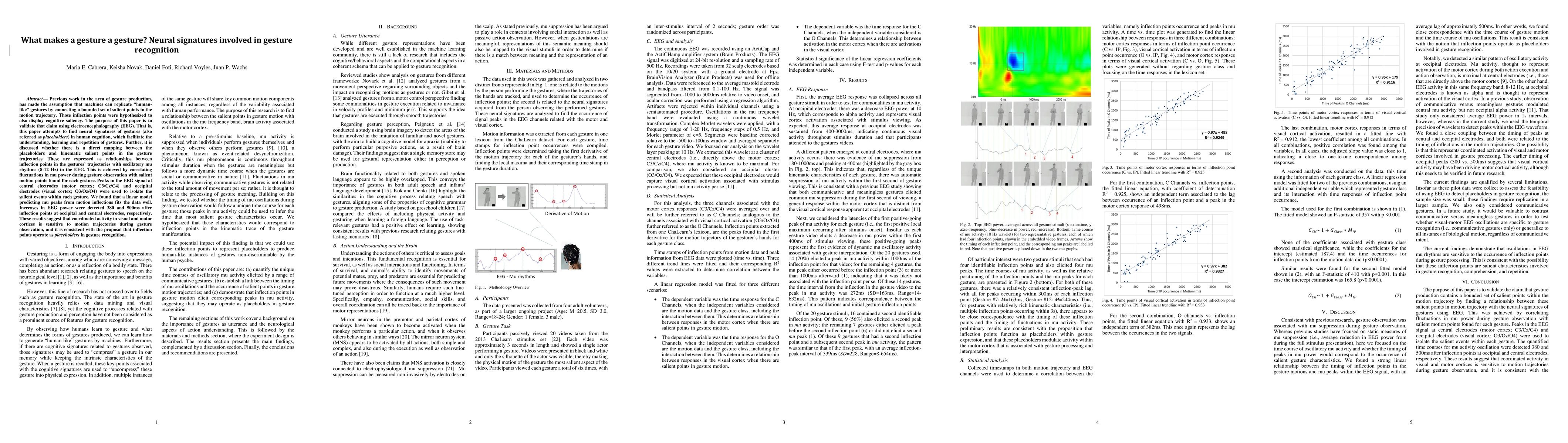 Previous work in the area of gesture production, has made the assumption that machines can replicate "human-like" gestures by connecting a bounded set of salient points in the motion trajectory. Those inflection points were hypothesized to also display cognitive saliency. The purpose of this paper is to validate that claim using electroencephalography (EEG). That is, this paper attempts to find neural signatures of gestures (also referred as placeholders) in human cognition, which facilitate the understanding, learning and repetition of gestures. Further, it is discussed whether there is a direct mapping between the placeholders and kinematic salient points in the gesture trajectories. These are expressed as relationships between inflection points in the gestures' trajectories with oscillatory mu rhythms (8-12 Hz) in the EEG. This is achieved by correlating fluctuations in mu power during gesture observation with salient motion points found for each gesture. Peaks in the EEG signal at central electrodes (motor cortex) and occipital electrodes (visual cortex) were used to isolate the salient events within each gesture. We found that a linear model predicting mu peaks from motion inflections fits the data well. Increases in EEG power were detected 380 and 500ms after inflection points at occipital and central electrodes, respectively. These results suggest that coordinated activity in visual and motor cortices is sensitive to motion trajectories during gesture observation, and it is consistent with the proposal that inflection points operate as placeholders in gesture recognition.