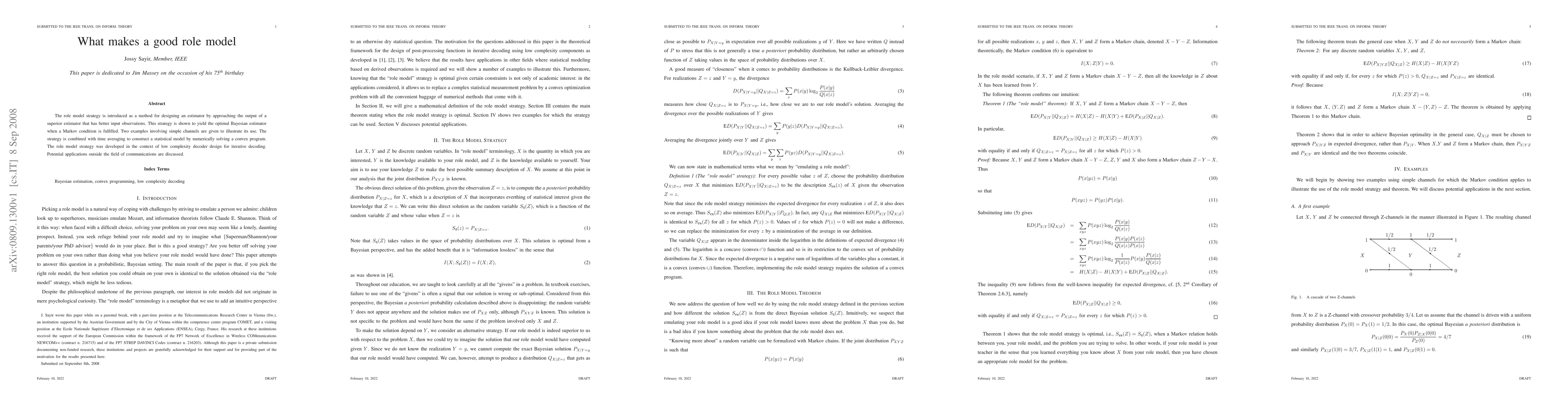 The role model strategy is introduced as a method for designing an estimator by approaching the output of a superior estimator that has better input observations. This strategy is shown to yield the optimal Bayesian estimator when a Markov condition is fulfilled. Two examples involving simple channels are given to illustrate its use. The strategy is combined with time averaging to construct a statistical model by numerically solving a convex program. The role model strategy was developed in the context of low complexity decoder design for iterative decoding. Potential applications outside the field of communications are discussed.
