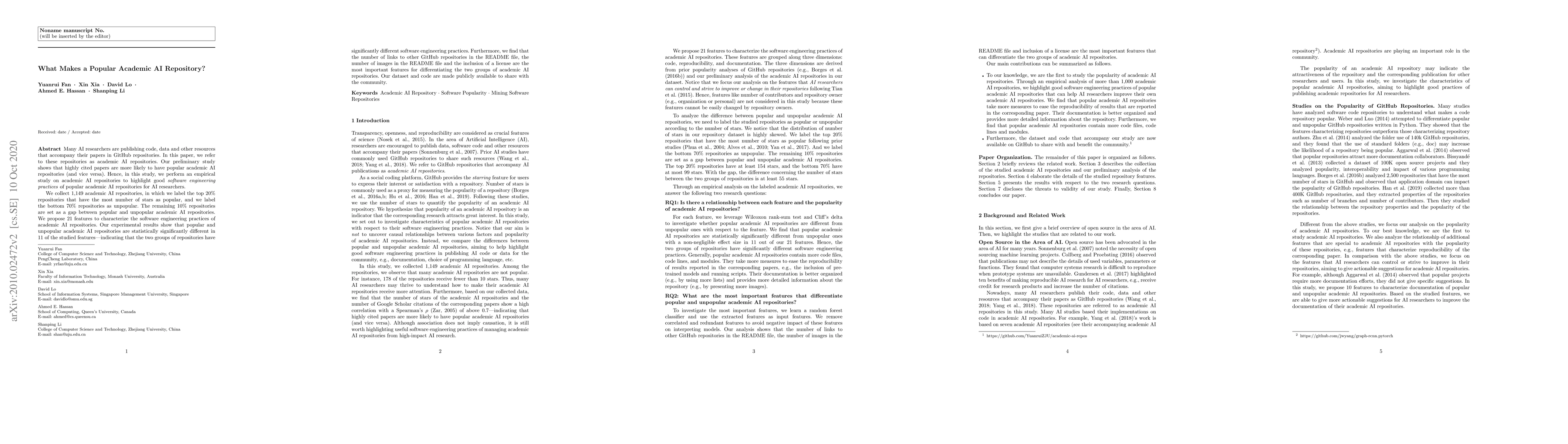 This paper investigates the software engineering practices of popular academic AI repositories on GitHub, comparing them to less popular ones. Key findings include significant differences in 11 features, with repository links, images, and licenses being the most influential in determining popularity.