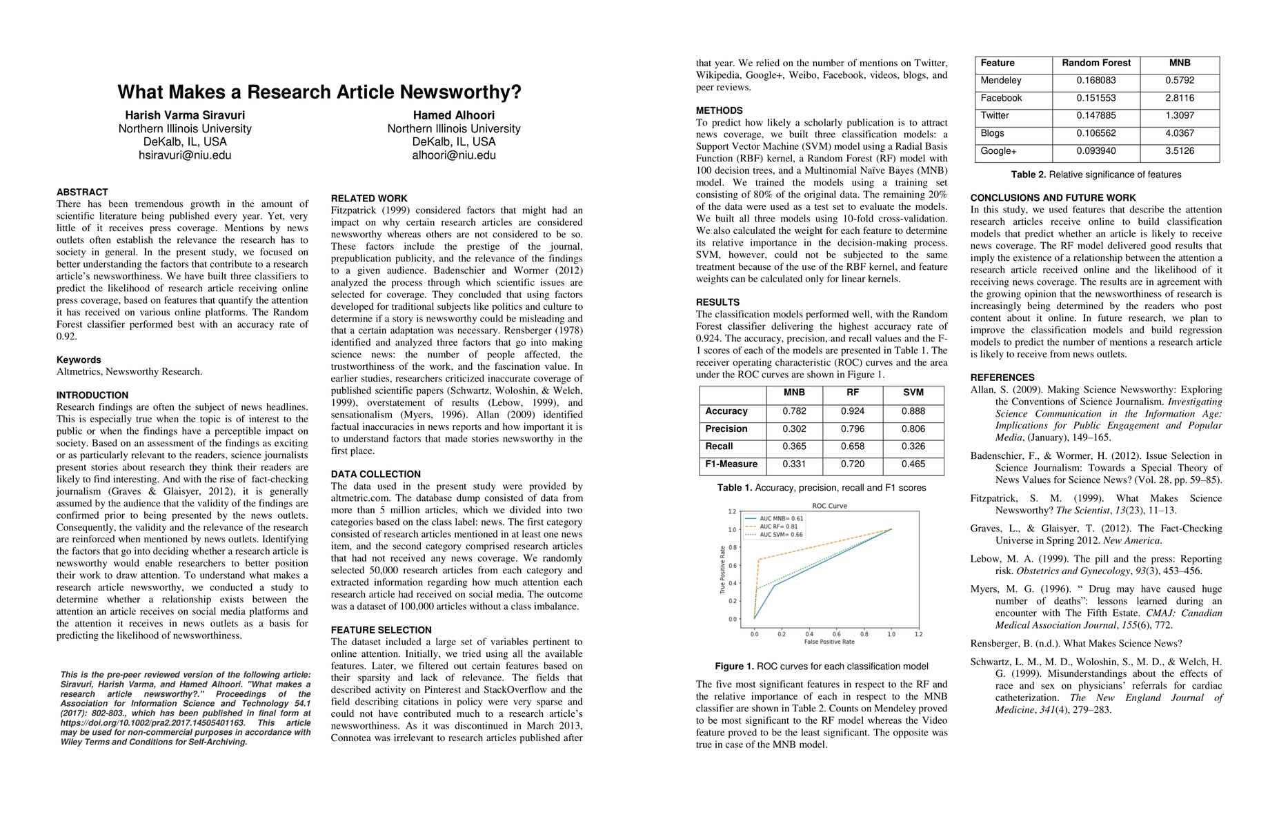 A study developed three classifiers to predict the newsworthiness of research articles based on online attention, with a Random Forest classifier achieving an accuracy rate of 0.92.