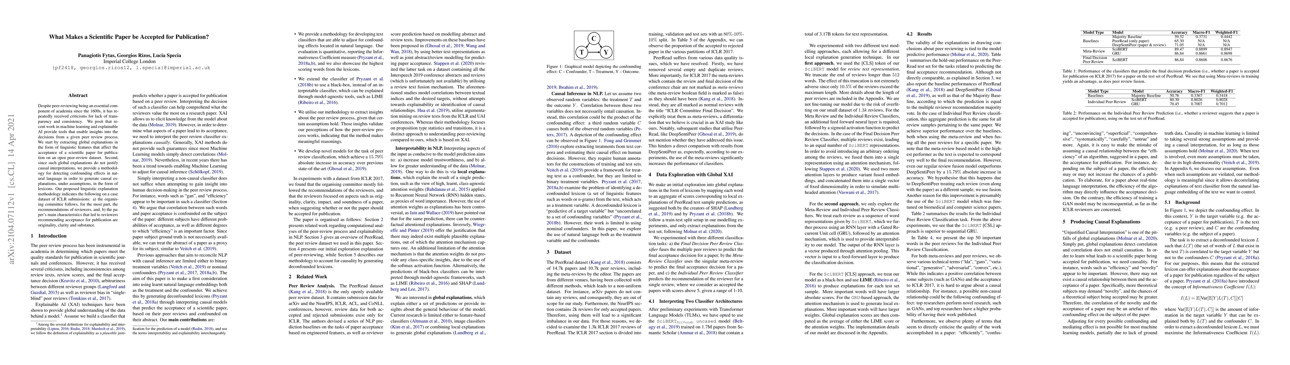 Despite peer-reviewing being an essential component of academia since the 1600s, it has repeatedly received criticisms for lack of transparency and consistency. We posit that recent work in machine learning and explainable AI provide tools that enable insights into the decisions from a given peer review process. We start by extracting global explanations in the form of linguistic features that affect the acceptance of a scientific paper for publication on an open peer-review dataset. Second, since such global explanations do not justify causal interpretations, we provide a methodology for detecting confounding effects in natural language in order to generate causal explanations, under assumptions, in the form of lexicons. Our proposed linguistic explanation methodology indicates the following on a case dataset of ICLR submissions: a) the organising committee follows, for the most part, the recommendations of reviewers, and, b) the paper's main characteristics that led to reviewers recommending acceptance for publication are originality, clarity and substance.