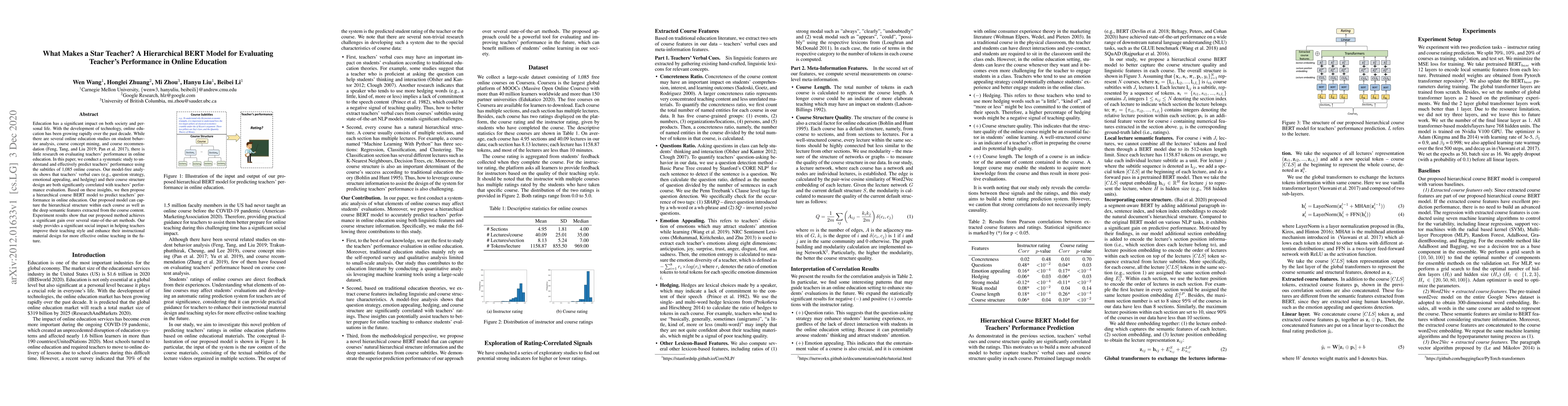 Education has a significant impact on both society and personal life. With the development of technology, online education has been growing rapidly over the past decade. While there are several online education studies on student behavior analysis, the course concept mining, and course recommendations (Feng, Tang, and Liu 2019; Pan et al. 2017), there is little research on evaluating teachers' performance in online education. In this paper, we conduct a systematic study to understand and effectively predict teachers' performance using the subtitles of 1,085 online courses. Our model-free analysis shows that teachers' verbal cues (e.g., question strategy, emotional appealing, and hedging) and their course structure design are both significantly correlated with teachers' performance evaluation. Based on these insights, we then propose a hierarchical course BERT model to predict teachers' performance in online education. Our proposed model can capture the hierarchical structure within each course as well as the deep semantic features extracted from the course content. Experiment results show that our proposed method achieves significant gain over several state-of-the-art methods. Our study provides a significant social impact in helping teachers improve their teaching style and enhance their instructional material design for more effective online teaching in the future.