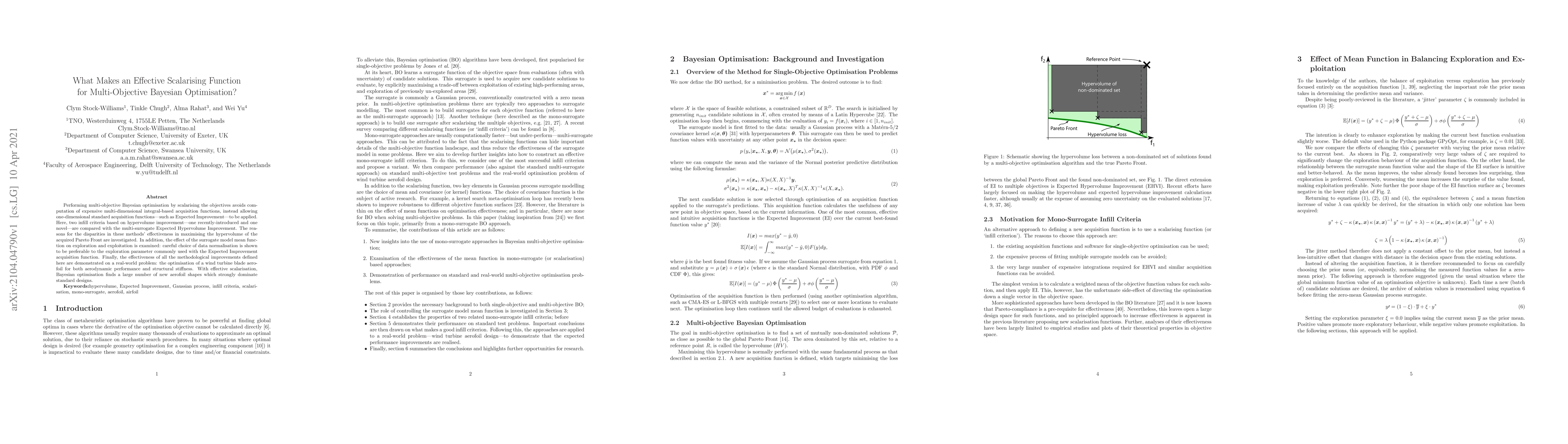 This paper investigates effective scalarising functions for multi-objective Bayesian optimisation, comparing two new infill criteria based on hypervolume improvement and examining their performance against multi-surrogate Expected Hypervolume Improvement. The study highlights the importance of data normalisation over exploration parameters for optimal results, and demonstrates the methodology's effectiveness in real-world applications like wind turbine blade aerofoil optimisation.