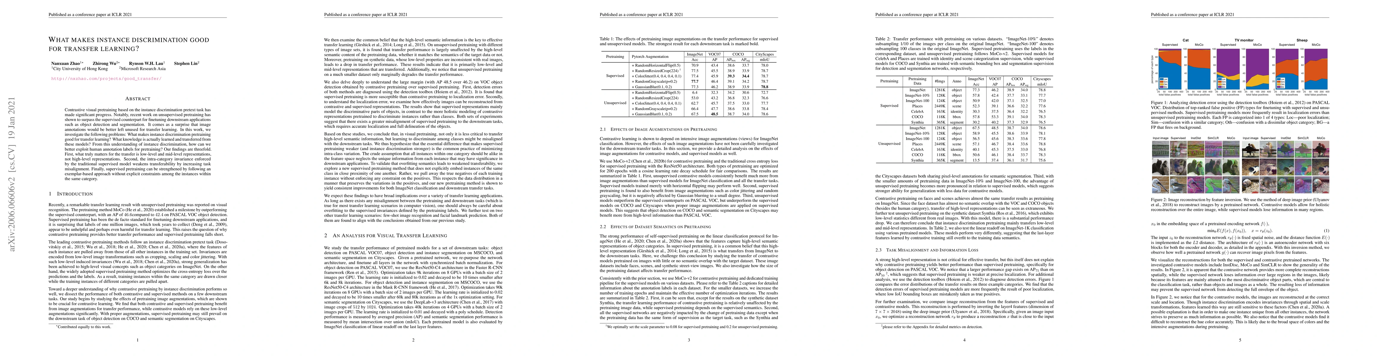 Contrastive visual pretraining based on the instance discrimination pretext task has made significant progress. Notably, recent work on unsupervised pretraining has shown to surpass the supervised counterpart for finetuning downstream applications such as object detection and segmentation. It comes as a surprise that image annotations would be better left unused for transfer learning. In this work, we investigate the following problems: What makes instance discrimination pretraining good for transfer learning? What knowledge is actually learned and transferred from these models? From this understanding of instance discrimination, how can we better exploit human annotation labels for pretraining? Our findings are threefold. First, what truly matters for the transfer is low-level and mid-level representations, not high-level representations. Second, the intra-category invariance enforced by the traditional supervised model weakens transferability by increasing task misalignment. Finally, supervised pretraining can be strengthened by following an exemplar-based approach without explicit constraints among the instances within the same category.