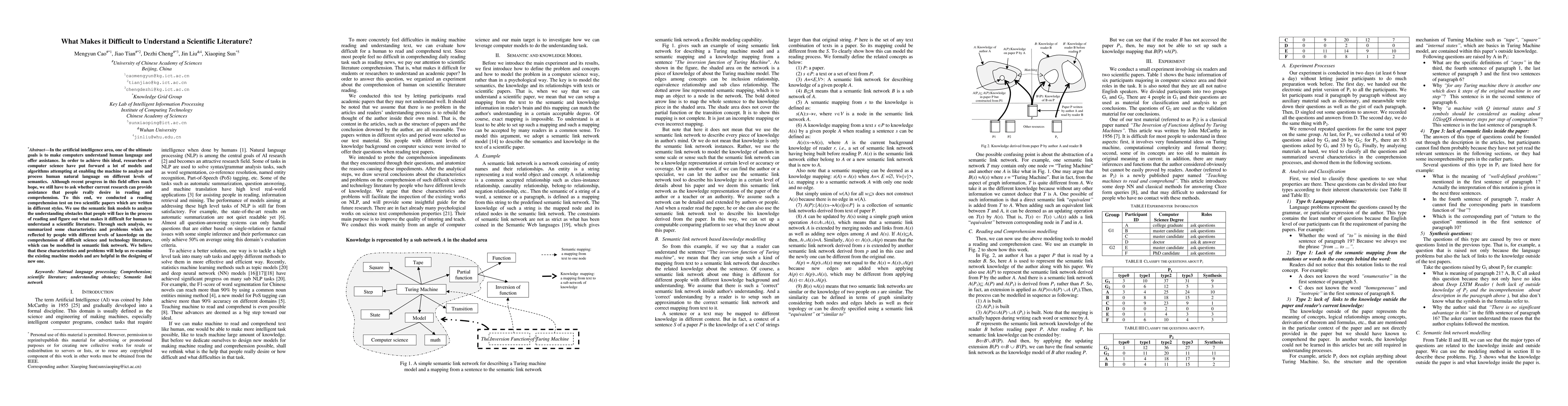 This paper investigates the difficulties people face in understanding scientific literature, using a reading comprehension test on two papers with different styles. It identifies characteristics and problems in comprehension, modeled in a semantic link network, to inform the improvement of machine models for understanding human language.