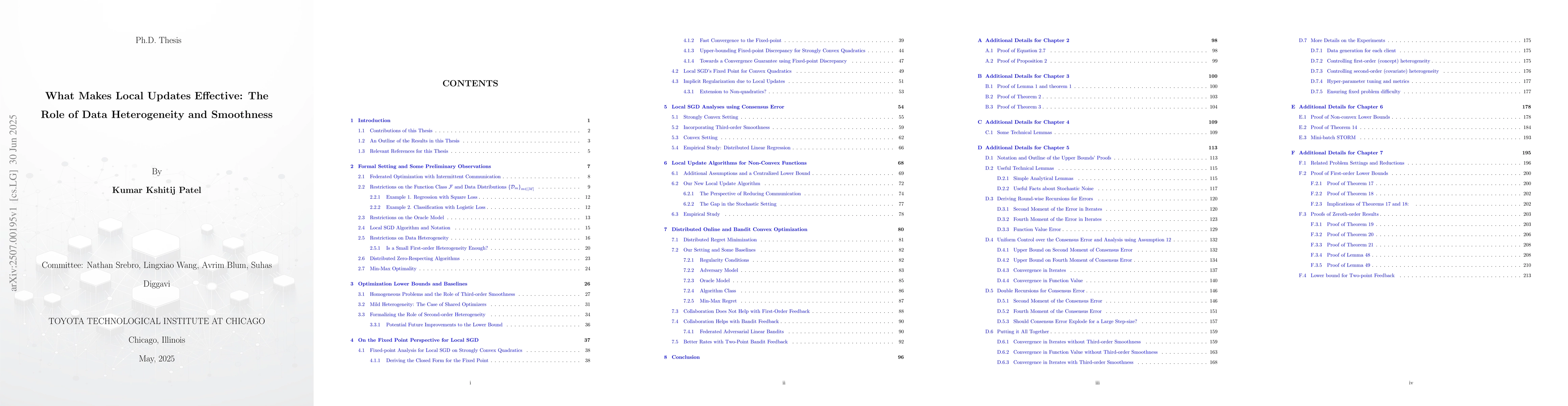 This thesis contributes to the theoretical understanding of local update algorithms, especially Local SGD, in distributed and federated optimization under realistic models of data heterogeneity. A central focus is on the bounded second-order heterogeneity assumption, which is shown to be both necessary and sufficient for local updates to outperform centralized or mini-batch methods in convex and non-convex settings. The thesis establishes tight upper and lower bounds in several regimes for various local update algorithms and characterizes the min-max complexity of multiple problem classes. At its core is a fine-grained consensus-error-based analysis framework that yields sharper finite-time convergence bounds under third-order smoothness and relaxed heterogeneity assumptions. The thesis also extends to online federated learning, providing fundamental regret bounds under both first-order and bandit feedback. Together, these results clarify when and why local updates offer provable advantages, and the thesis serves as a self-contained guide for analyzing Local SGD in heterogeneous environments.