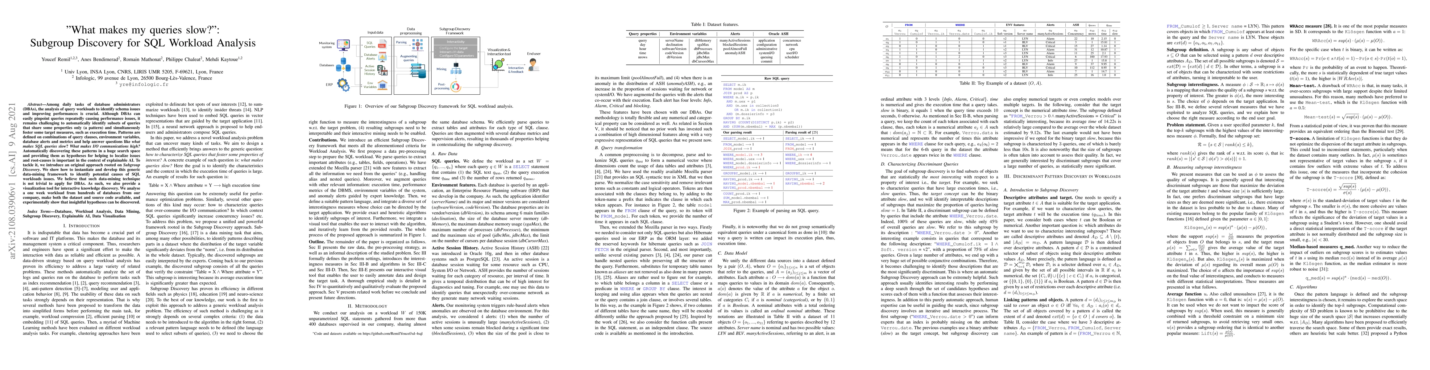 Among daily tasks of database administrators (DBAs), the analysis of query workloads to identify schema issues and improving performances is crucial. Although DBAs can easily pinpoint queries repeatedly causing performance issues, it remains challenging to automatically identify subsets of queries that share some properties only (a pattern) and simultaneously foster some target measures, such as execution time. Patterns are defined on combinations of query clauses, environment variables, database alerts and metrics and help answer questions like what makes SQL queries slow? What makes I/O communications high? Automatically discovering these patterns in a huge search space and providing them as hypotheses for helping to localize issues and root-causes is important in the context of explainable AI. To tackle it, we introduce an original approach rooted on Subgroup Discovery. We show how to instantiate and develop this generic data-mining framework to identify potential causes of SQL workloads issues. We believe that such data-mining technique is not trivial to apply for DBAs. As such, we also provide a visualization tool for interactive knowledge discovery. We analyse a one week workload from hundreds of databases from our company, make both the dataset and source code available, and experimentally show that insightful hypotheses can be discovered.
