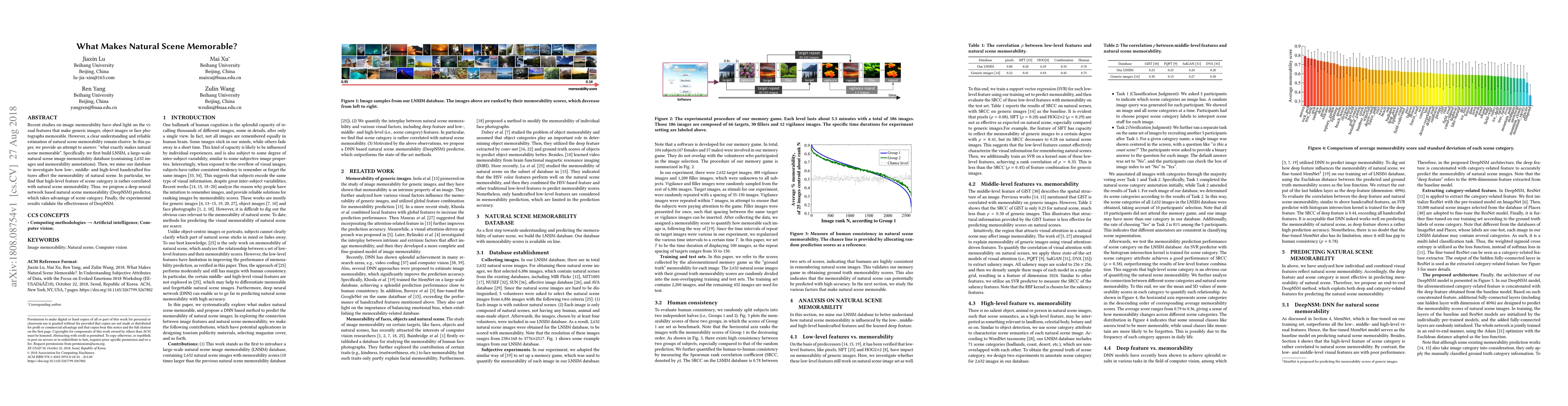 This paper explores what makes natural scenes memorable by creating a large-scale database (LNSIM) and analyzing how various visual features influence memorability. It finds that scene category is a key factor and proposes a deep neural network (DeepNSM) that leverages this to predict scene memorability, demonstrating its effectiveness.