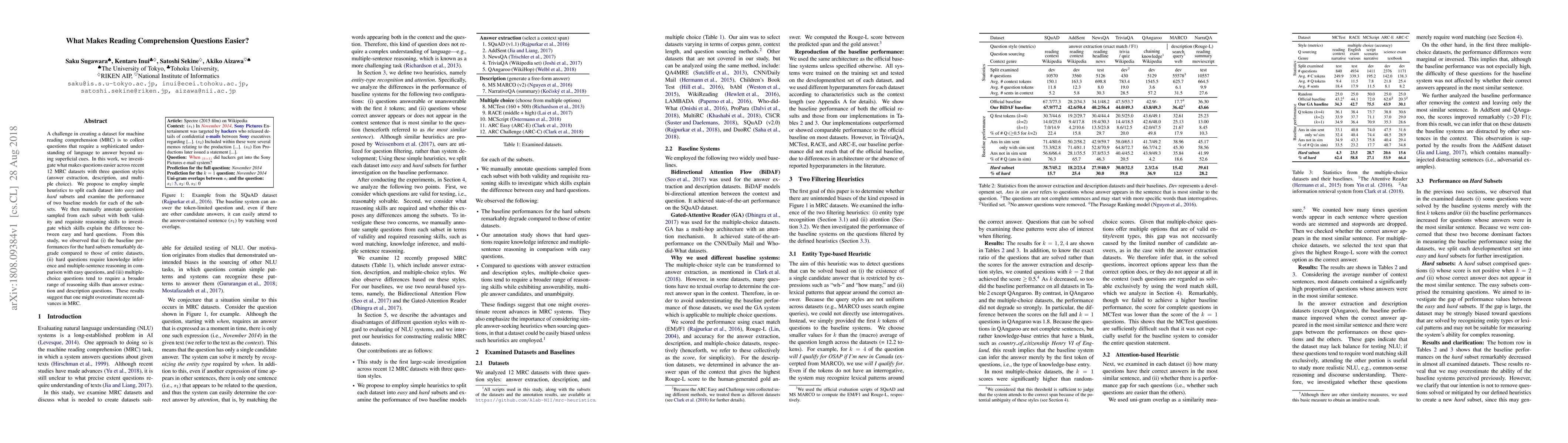 This paper investigates factors that make reading comprehension questions easier by analyzing 12 MRC datasets. It finds that hard questions require more knowledge inference and multiple-sentence reasoning, while multiple-choice questions demand a broader range of reasoning skills compared to simpler question types.