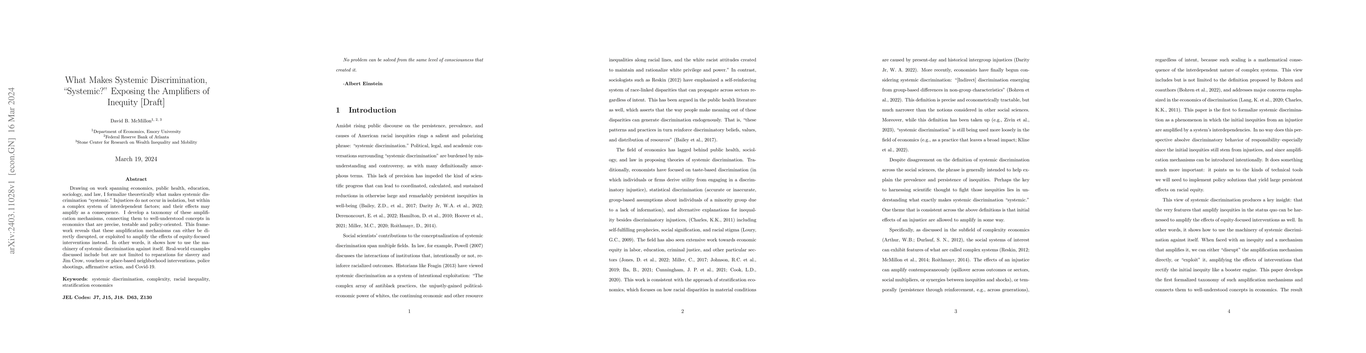 This paper theorizes what makes systemic discrimination "systemic" by exploring how interdependent factors within complex systems amplify inequities. It develops a taxonomy of amplification mechanisms, offering precise, testable, and policy-oriented insights to disrupt these mechanisms or leverage them to enhance equity-focused interventions, illustrated with examples like reparations and affirmative action.