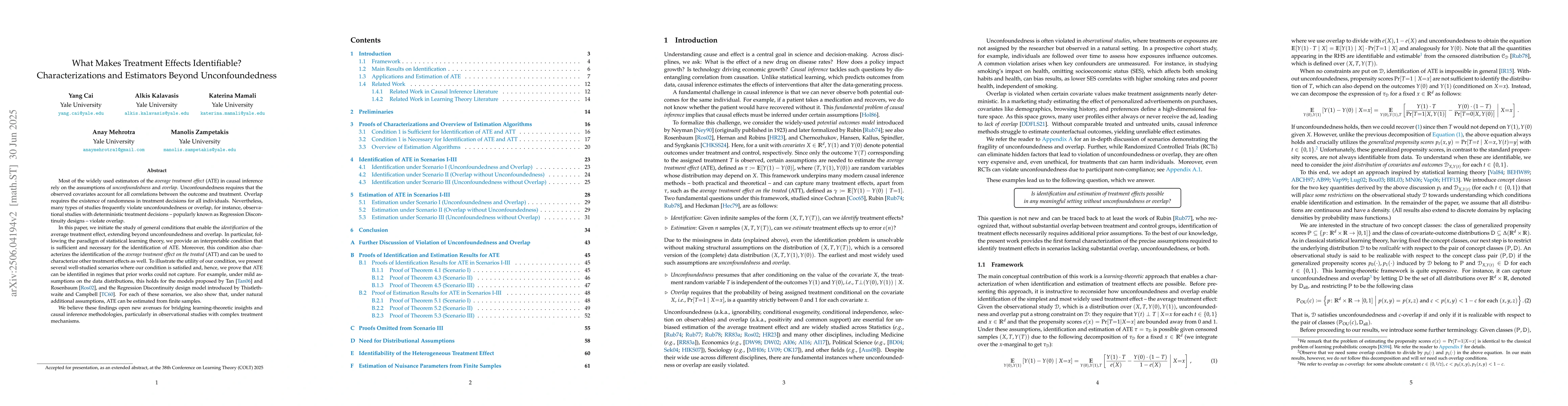 The paper initiates the study of general conditions for identifying average treatment effects (ATE) beyond unconfoundedness and overlap, using statistical learning theory paradigms.