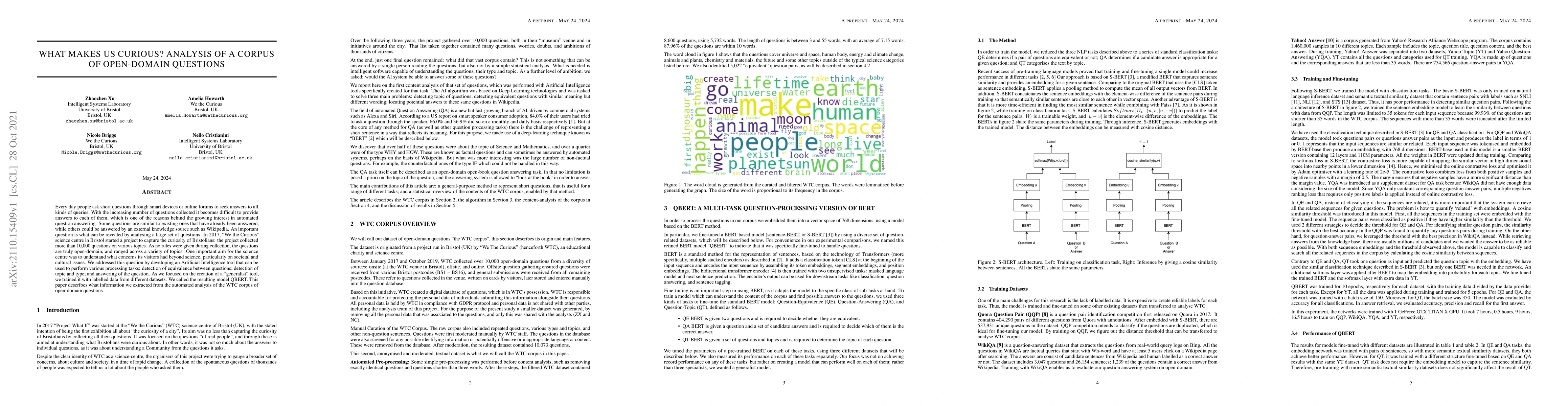 Every day people ask short questions through smart devices or online forums to seek answers to all kinds of queries. With the increasing number of questions collected it becomes difficult to provide answers to each of them, which is one of the reasons behind the growing interest in automated question answering. Some questions are similar to existing ones that have already been answered, while others could be answered by an external knowledge source such as Wikipedia. An important question is what can be revealed by analysing a large set of questions. In 2017, "We the Curious" science centre in Bristol started a project to capture the curiosity of Bristolians: the project collected more than 10,000 questions on various topics. As no rules were given during collection, the questions are truly open-domain, and ranged across a variety of topics. One important aim for the science centre was to understand what concerns its visitors had beyond science, particularly on societal and cultural issues. We addressed this question by developing an Artificial Intelligence tool that can be used to perform various processing tasks: detection of equivalence between questions; detection of topic and type; and answering of the question. As we focused on the creation of a "generalist" tool, we trained it with labelled data from different datasets. We called the resulting model QBERT. This paper describes what information we extracted from the automated analysis of the WTC corpus of open-domain questions.