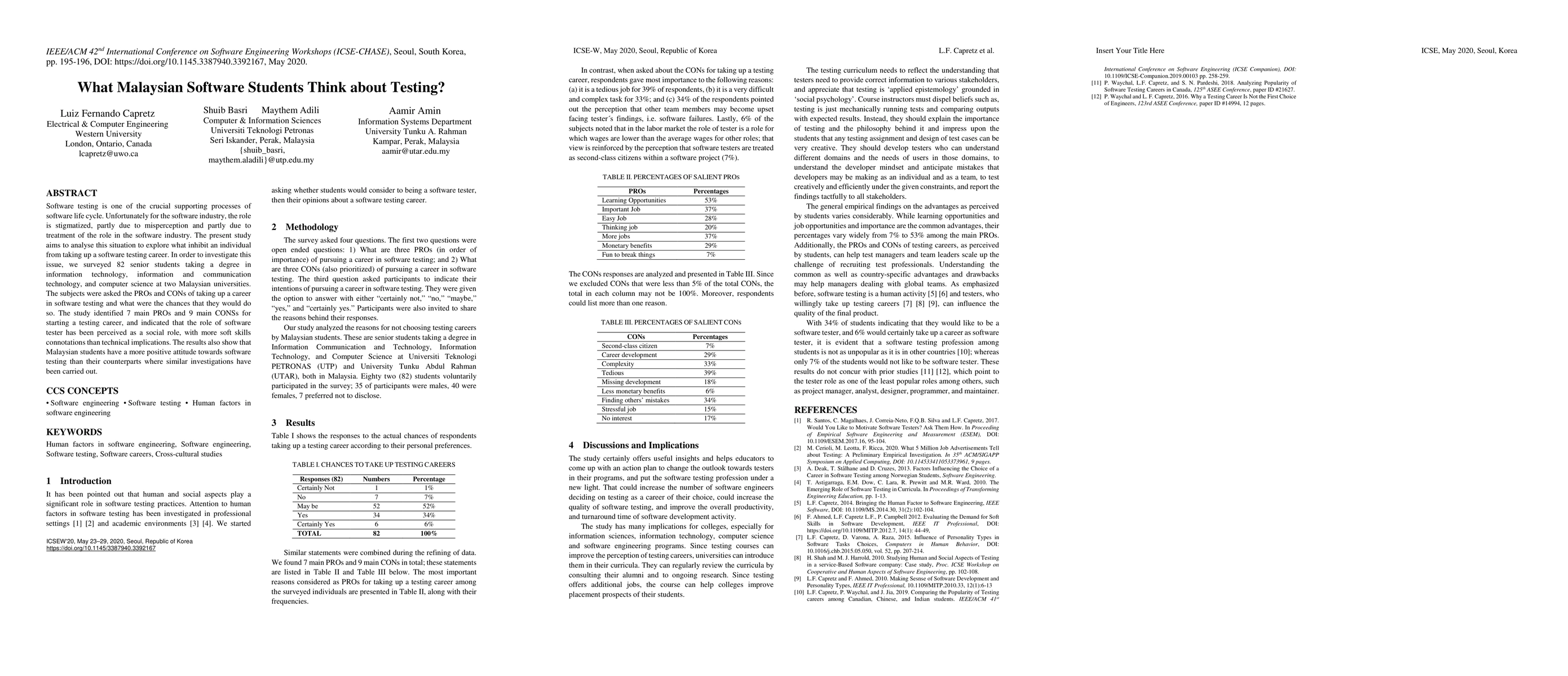 This study surveyed Malaysian IT students to explore perceptions of software testing careers, identifying 7 main pros and 9 cons. The findings suggest that software testing is viewed more as a social role requiring soft skills rather than technical skills, and Malaysian students hold a more positive attitude towards it compared to other regions.