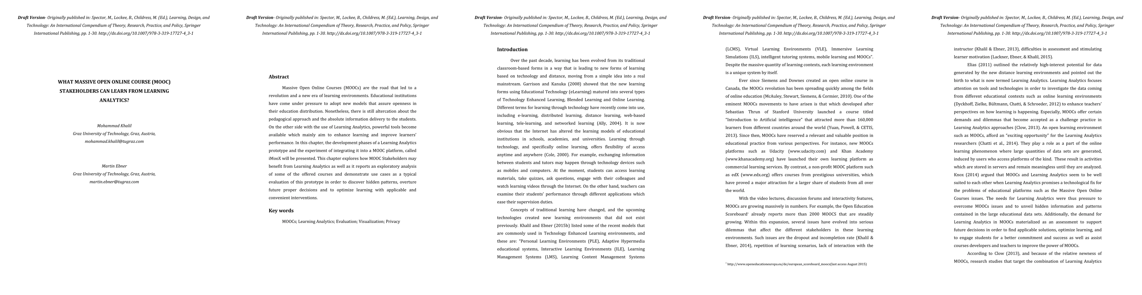 Massive Open Online Courses (MOOCs) are the road that led to a revolution and a new era of learning environments. Educational institutions have come under pressure to adopt new models that assure openness in their education distribution. Nonetheless, there is still altercation about the pedagogical approach and the absolute information delivery to the students. On the other side with the use of Learning Analytics, powerful tools become available which mainly aim to enhance learning and improve learners performance. In this chapter, the development phases of a Learning Analytics prototype and the experiment of integrating it into a MOOC platform, called iMooX will be presented. This chapter explores how MOOC Stakeholders may benefit from Learning Analytics as well as it reports an exploratory analysis of some of the offered courses and demonstrate use cases as a typical evaluation of this prototype in order to discover hidden patterns, overture future proper decisions and to optimize learning with applicable and convenient interventions.