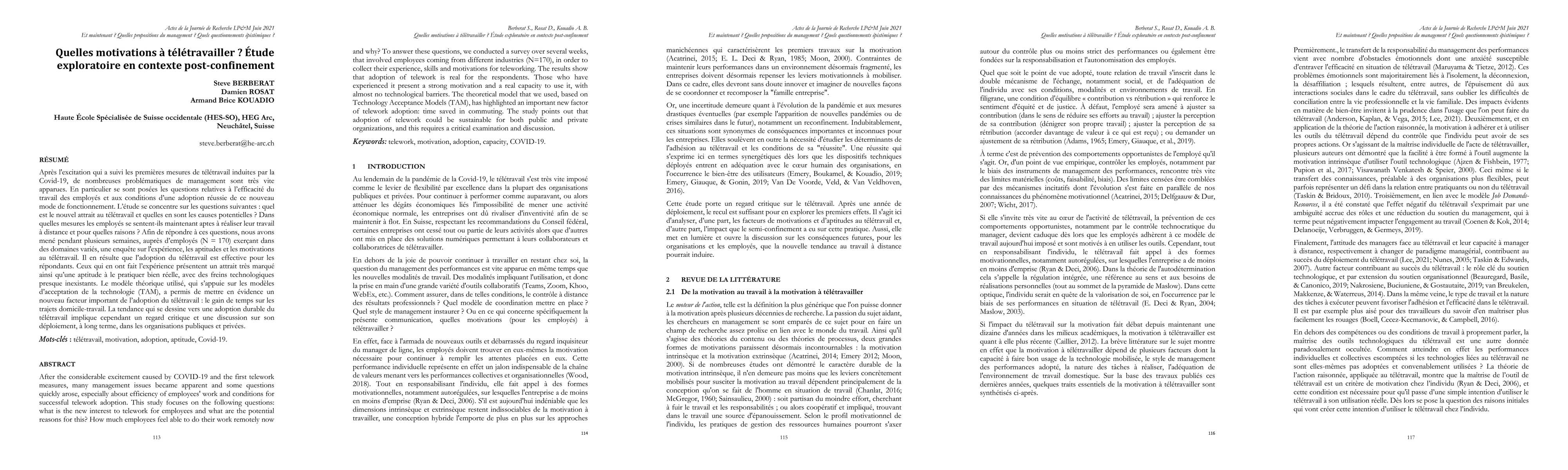 After the considerable excitement caused by COVID-19 and the first telework measures, many management issues became apparent and some questions quickly arose, especially about efficiency of employees' work and conditions for successful telework adoption. This study focuses on the following questions: what is the new interest to telework for employees and what are the potential reasons for this? How much employees feel able to do their work remotely now and why? To answer these questions, we conducted a survey over several weeks, that involved employees coming from different industries (N=170), in order to collect their experience, skills and motivations for teleworking. The results show that adoption of telework is real for the respondents. Those who have experienced it present a strong motivation and a real capacity to use it, with almost no technological barriers. The theoretical model that we used, based on Technology Acceptance Models (TAM), has highlighted an important new factor of telework adoption: time saved in commuting. The study points out that adoption of telework could be sustainable for both public and private organizations, and this requires a critical examination and discussion.